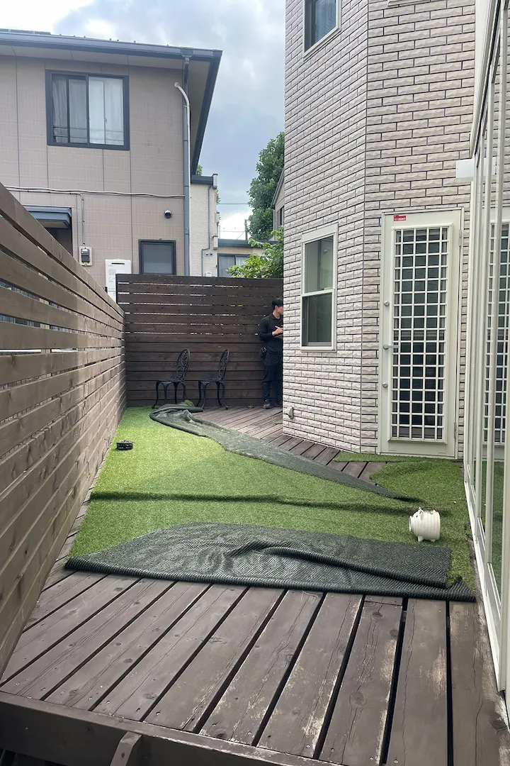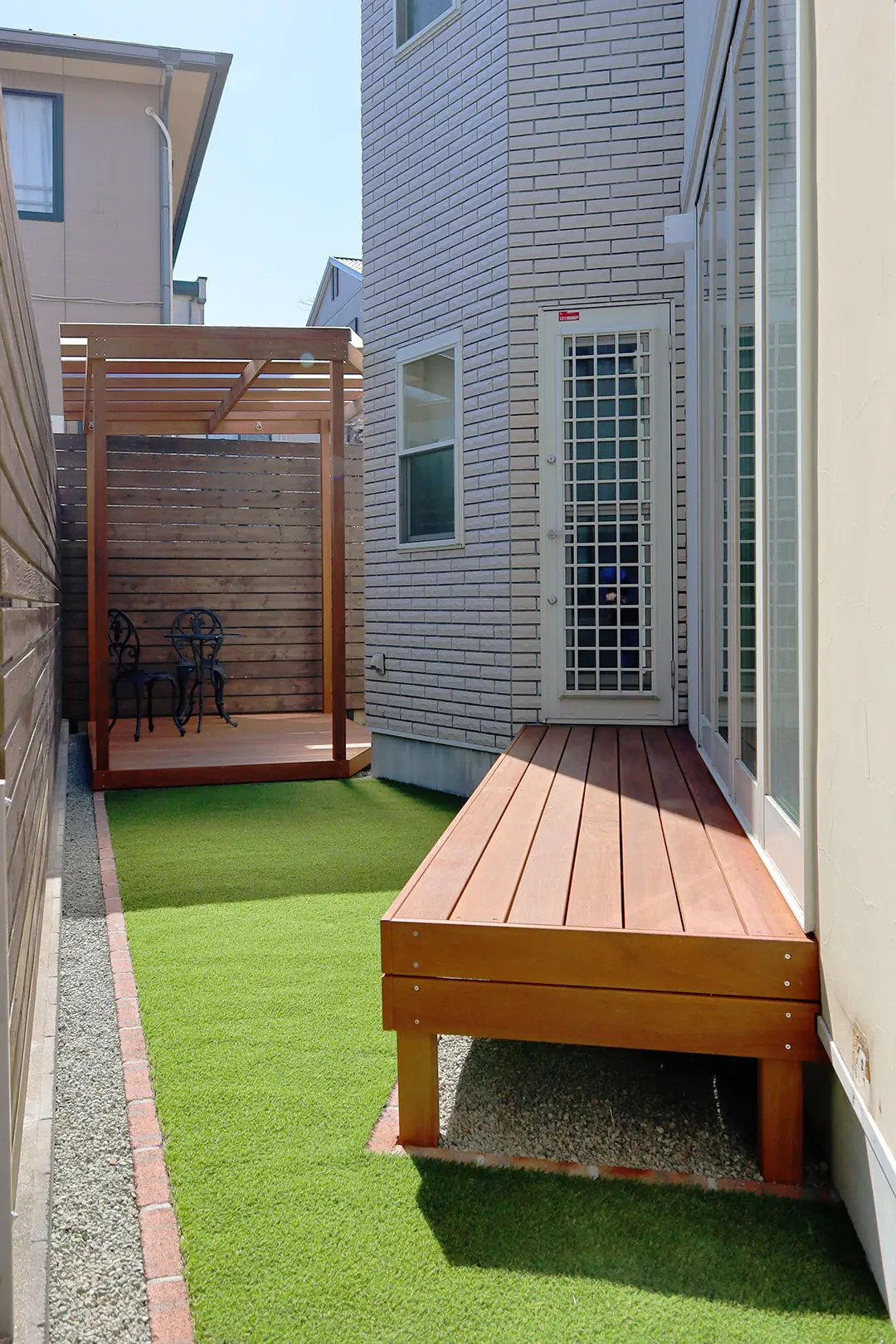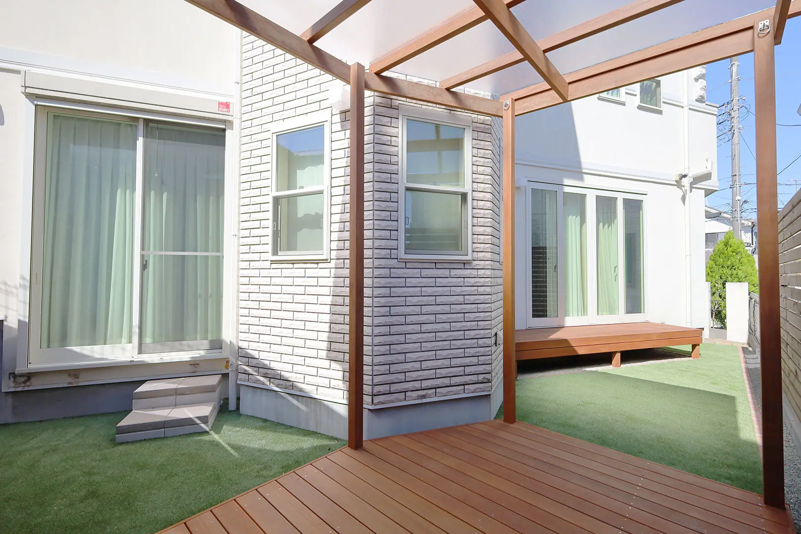 ウッドデッキ:ウリン材 / 屋根材:ポリカーボネート / 人工芝:グリーンフィールド リアリーターフ