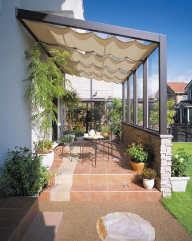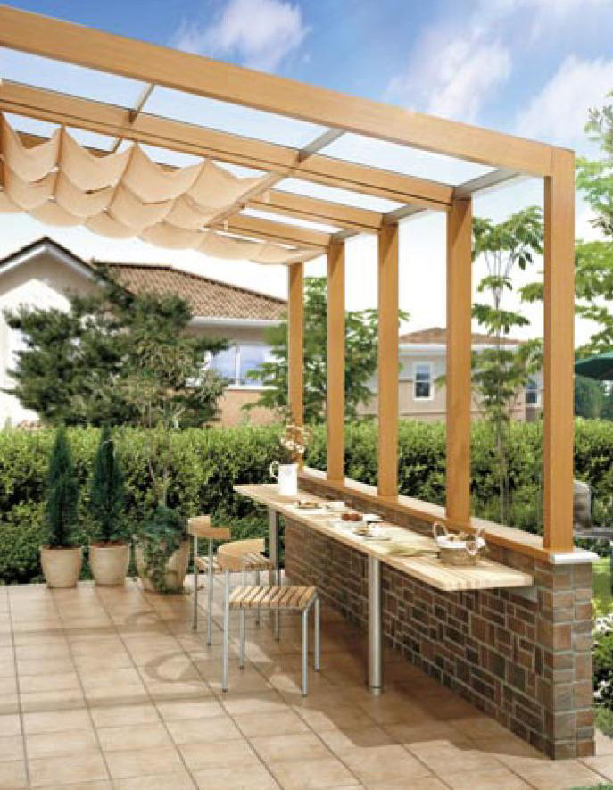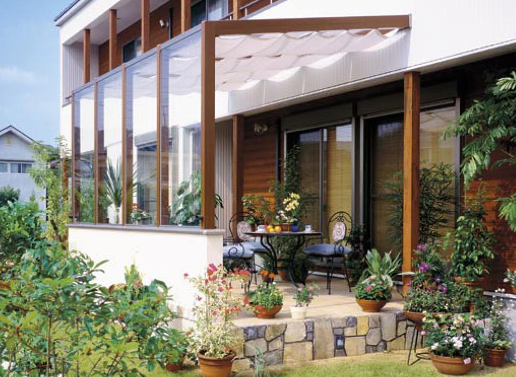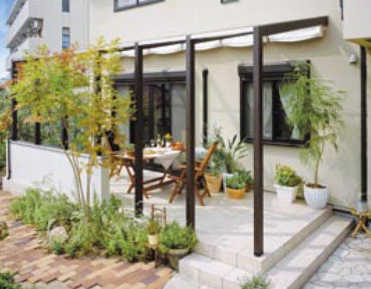 屋根と正面の壁のみの構造で、両サイドが解放されているタイプ。日差しを遮るシェードから柔かい太陽の光が届き、風がとおりぬける、ほっとする空間。お友達とのティータイムをすごす楽しい午後の場所に。