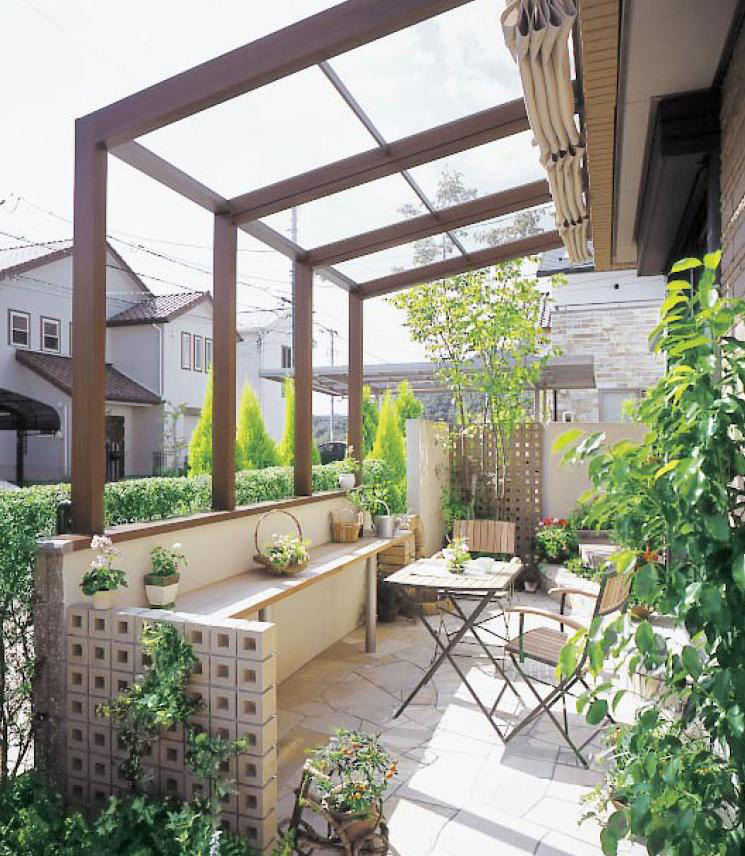 屋根と支柱だけのオープンテラス空間。 ガーデニング作業の合間にひと休み。ワンちゃんも、のびのびくつろげる快適空間です。