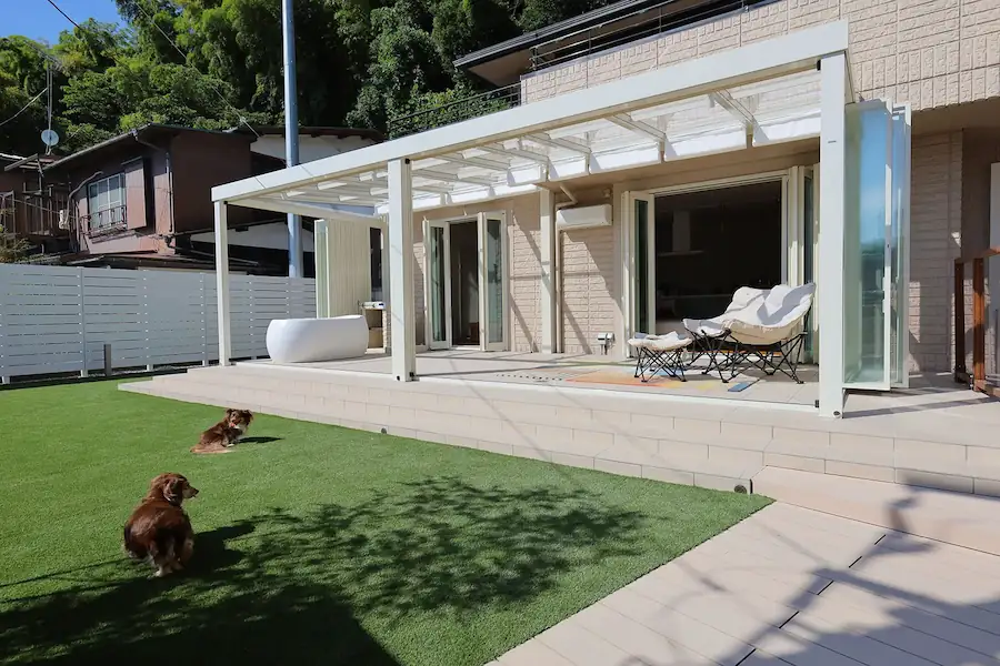 小型犬にも優しいドッグラン。お部屋と出入りできるガーデンルーム