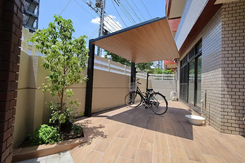 木調のタイルテラスで雑草対策。お庭全体を有効活用