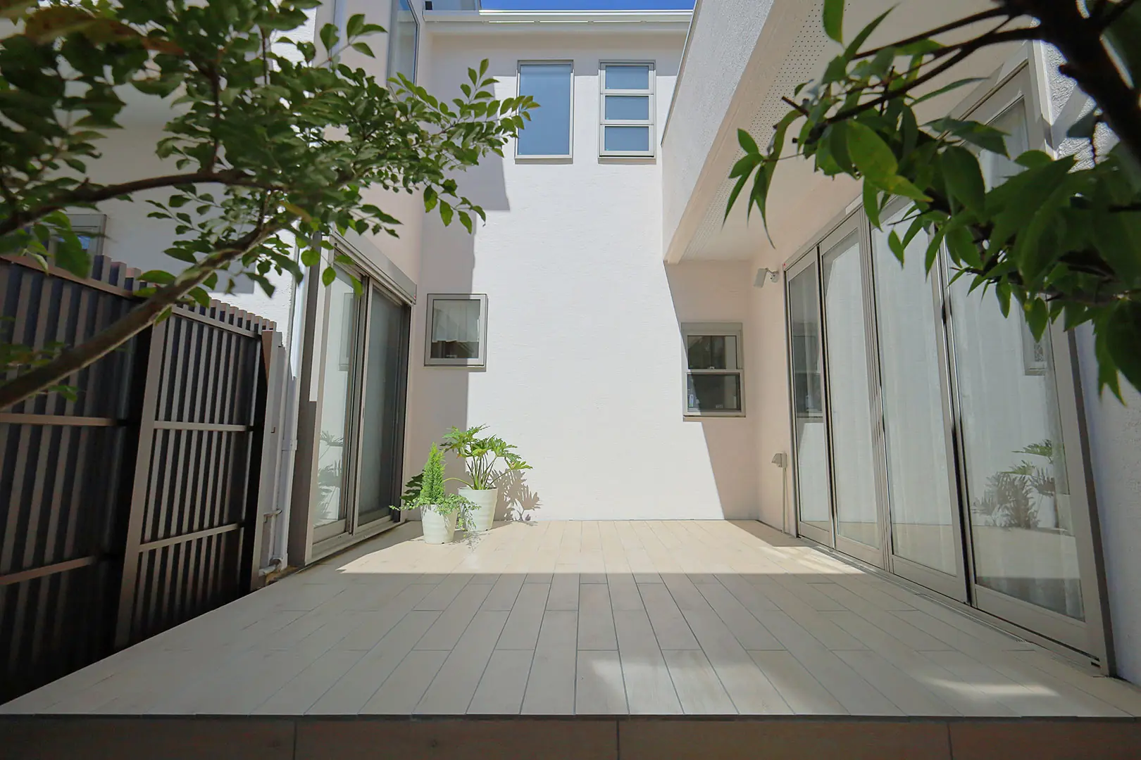コの字型の中庭を、木調タイルのテラスと縦格子フェンスでリフォーム