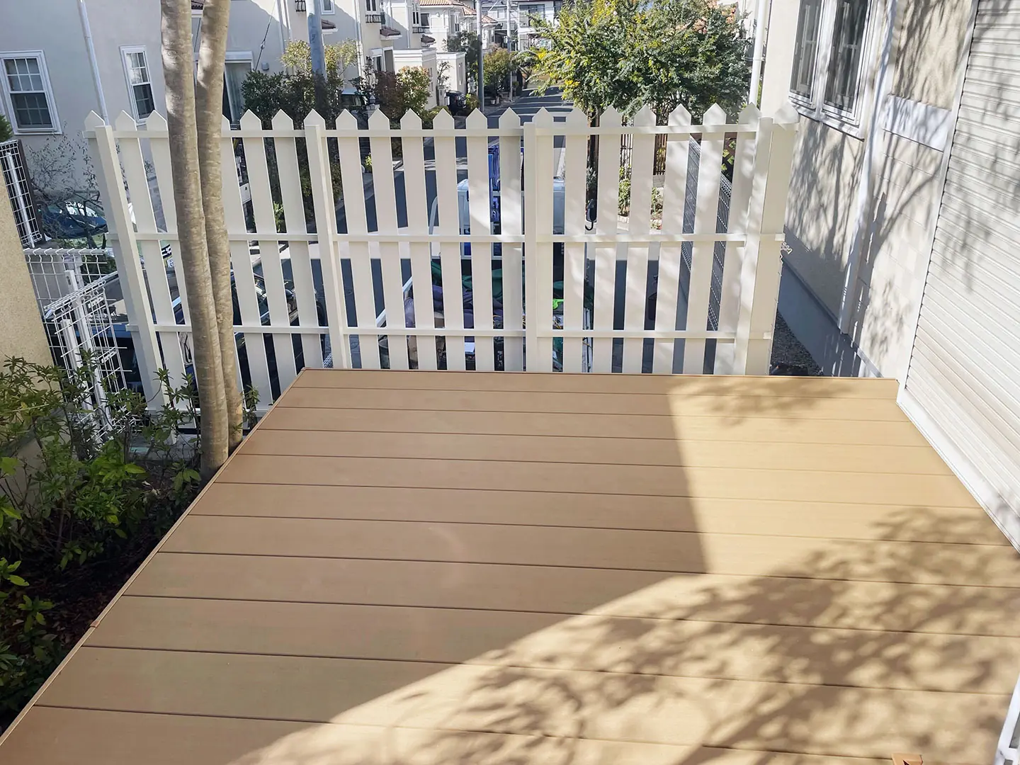 明るい色をご希望でしたので、フェンスは白に、デッキも明るいウッド色をお選びしました。大きなシマトネリコの木洩れ日にカントリー調のフェンスが調和し、心地良く使いやすいお庭に生まれ変わりました。