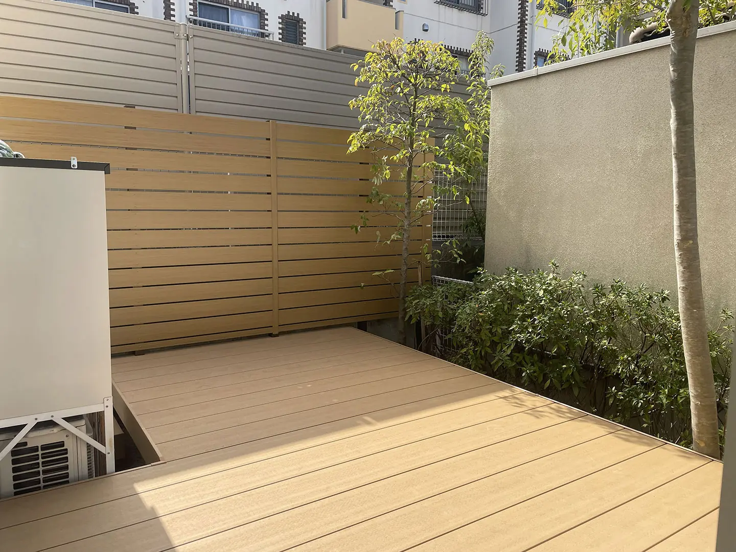 ウッドデッキ:LIXIL レストステージ/ フェンス:F&Fマイティウッド デコⅡ、ラインスタイルLタイプ