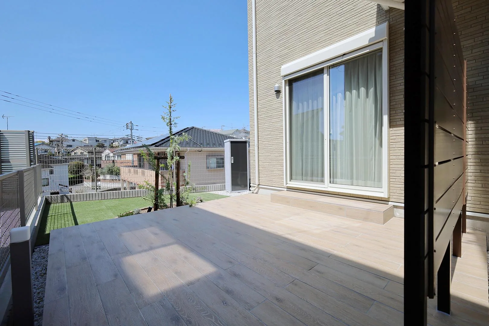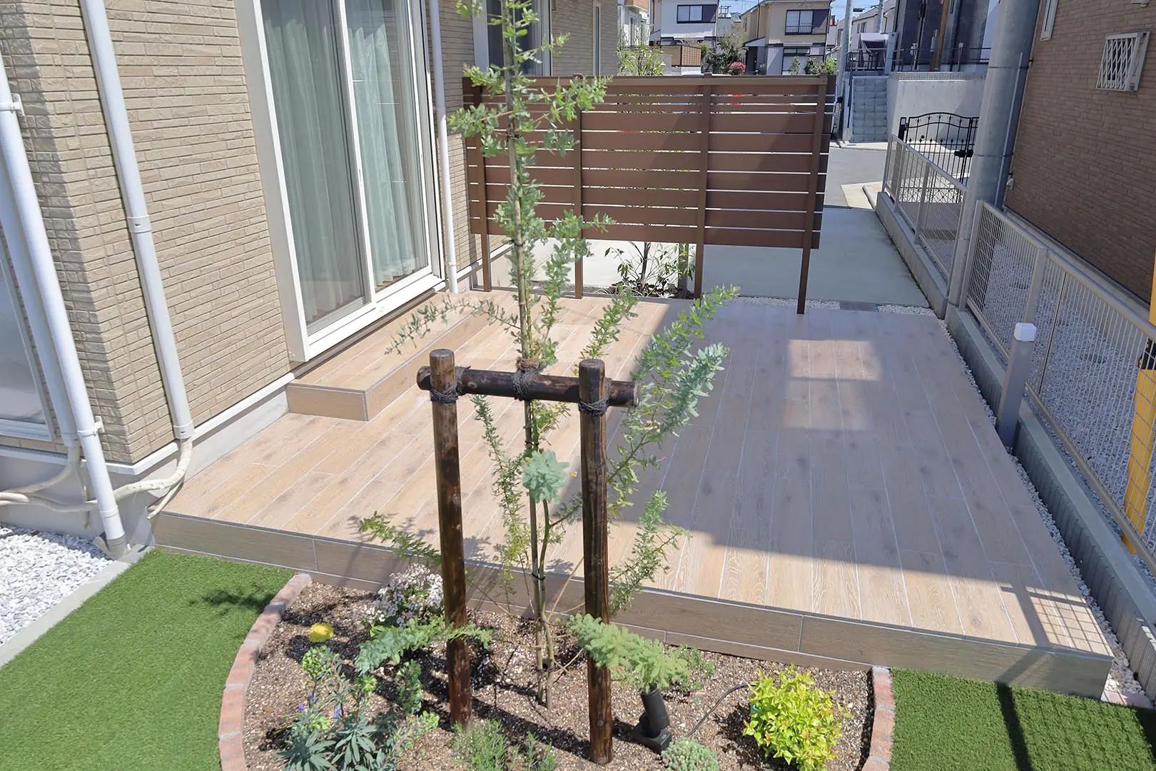 タイルテラスは、室内からテラス、テラスから人工芝や駐車場へ、段階的に上り下りできる設計です。それぞれの段差が小さいので上り下りにストレスがなく、お庭全体を歩きまわることができ、視覚的にも広々と感じられるメリットがあります。木調のタイルが、植栽やボーダーフェンスと調和するナチュラルテイストのお庭になりました。