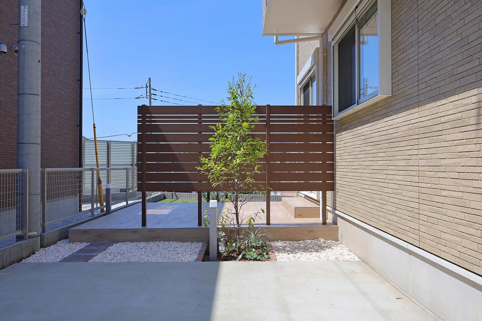 お庭は袋小路の突き当りに位置するため、人通りは多くありませんが、視線がまっすぐに入ってきます。そこで、目隠しフェンスを建て、さらに植栽を添えました。植栽に視線が集まり目隠し効果が高まります。