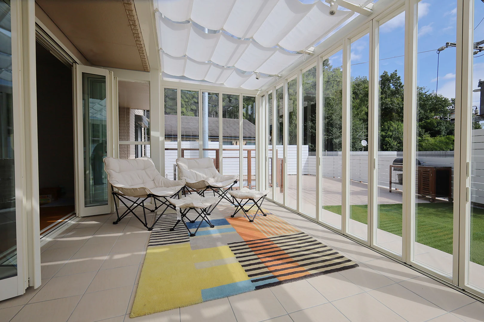 特にご希望を頂いたのが、ガラス張りのガーデンルームです。扉を閉めてお部屋のような感覚で使うほか、季節によっては扉を全開して、オープンテラスとしても使うこともできます。
