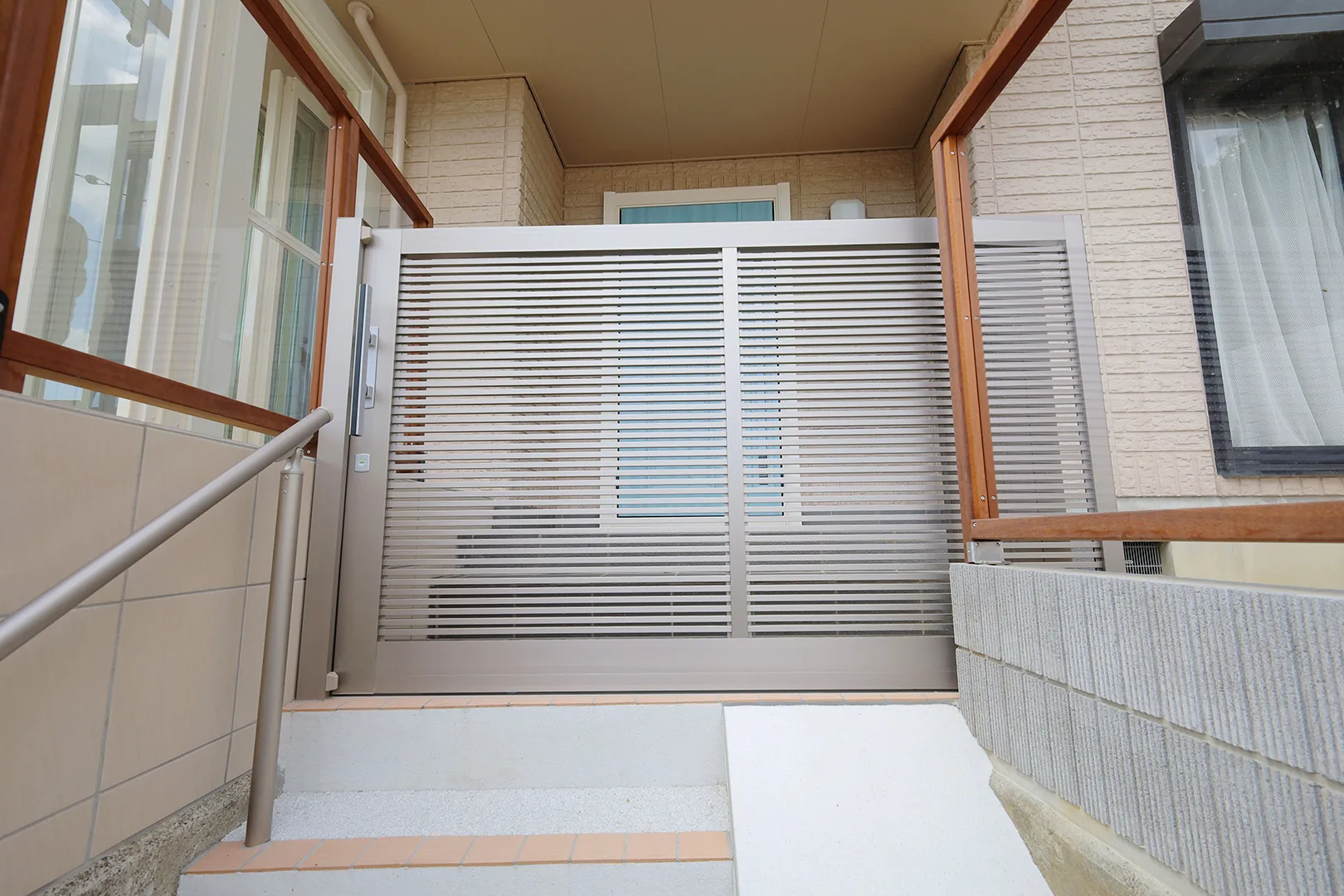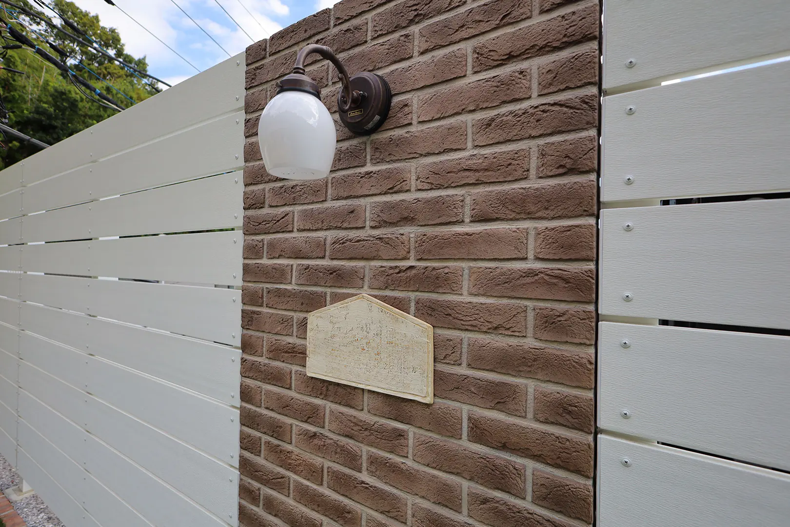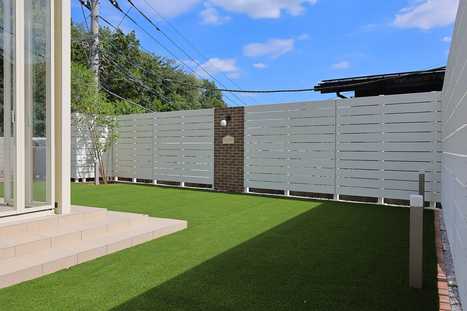 お庭の周りは目隠しフェンスで囲んでプライベート空間に。レンガ調の壁は「イギリスの風景の一部を切り取ったよう」とお客様に喜んで頂きました。
