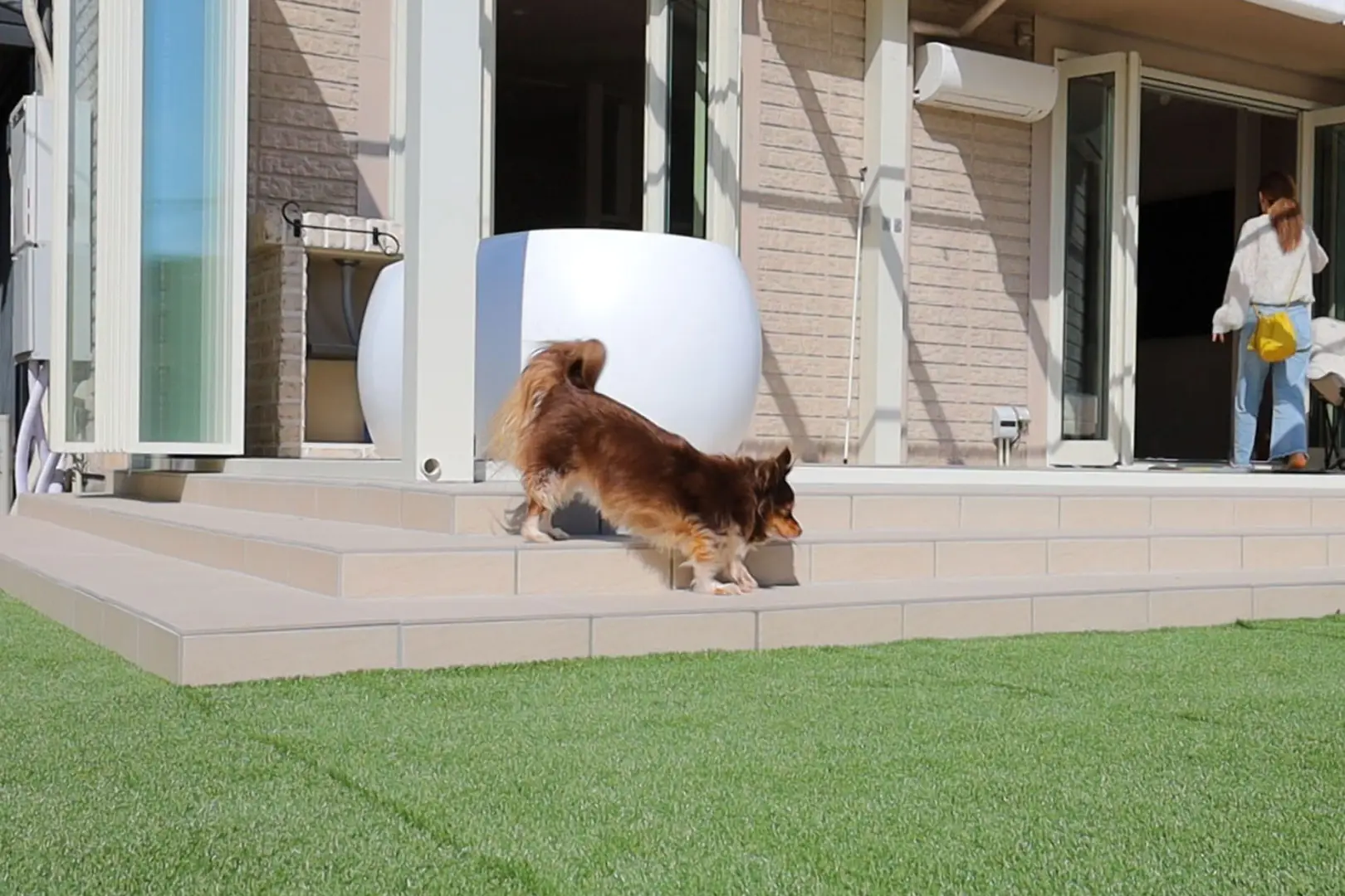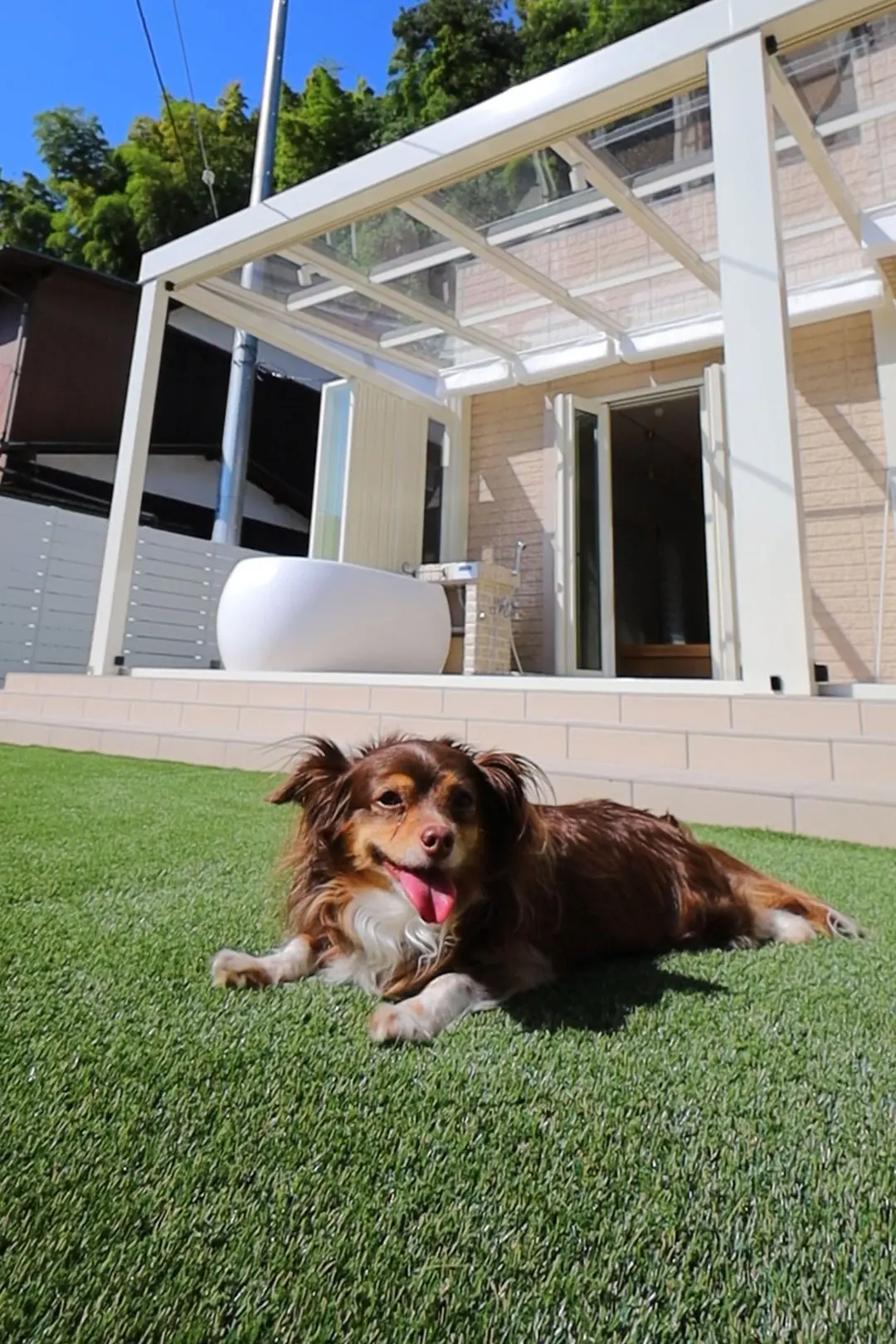 タイルテラスには念のため、排水のドレーンを設けました。もしお湯が溢れることがあってもスムーズに排水されテラスが水浸しになることはありません。お庭は人工芝を敷設し、愛犬のドッグランとしても楽しめます。テラスの段差を低くして、小型犬のワンちゃんが自分たちでお部屋とお庭を自由に出入りができるように配慮しました。