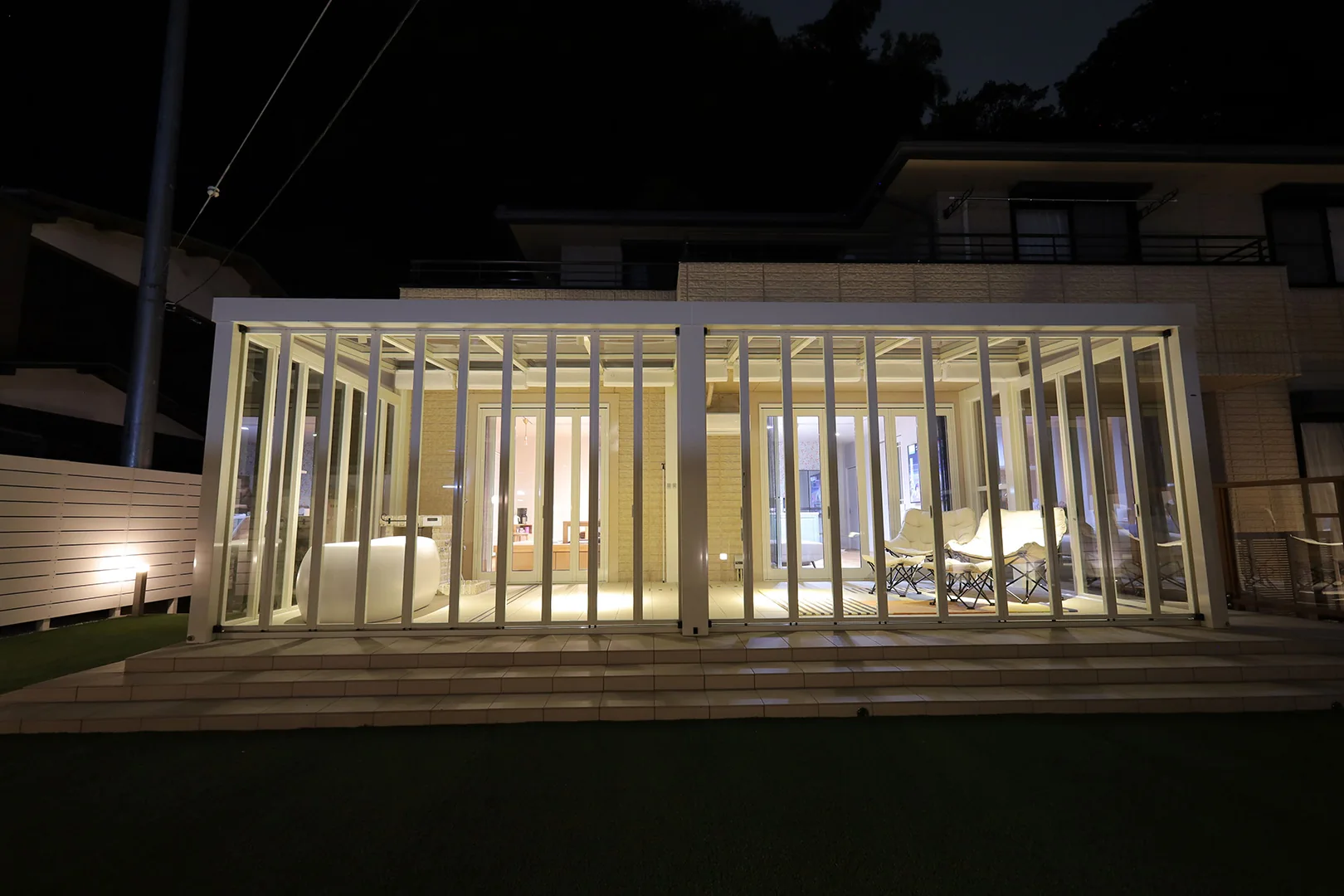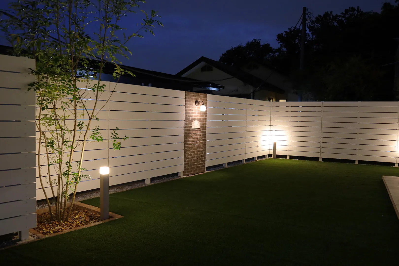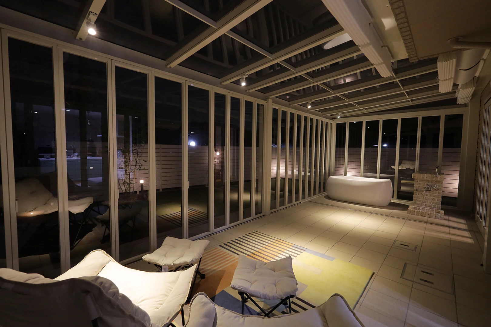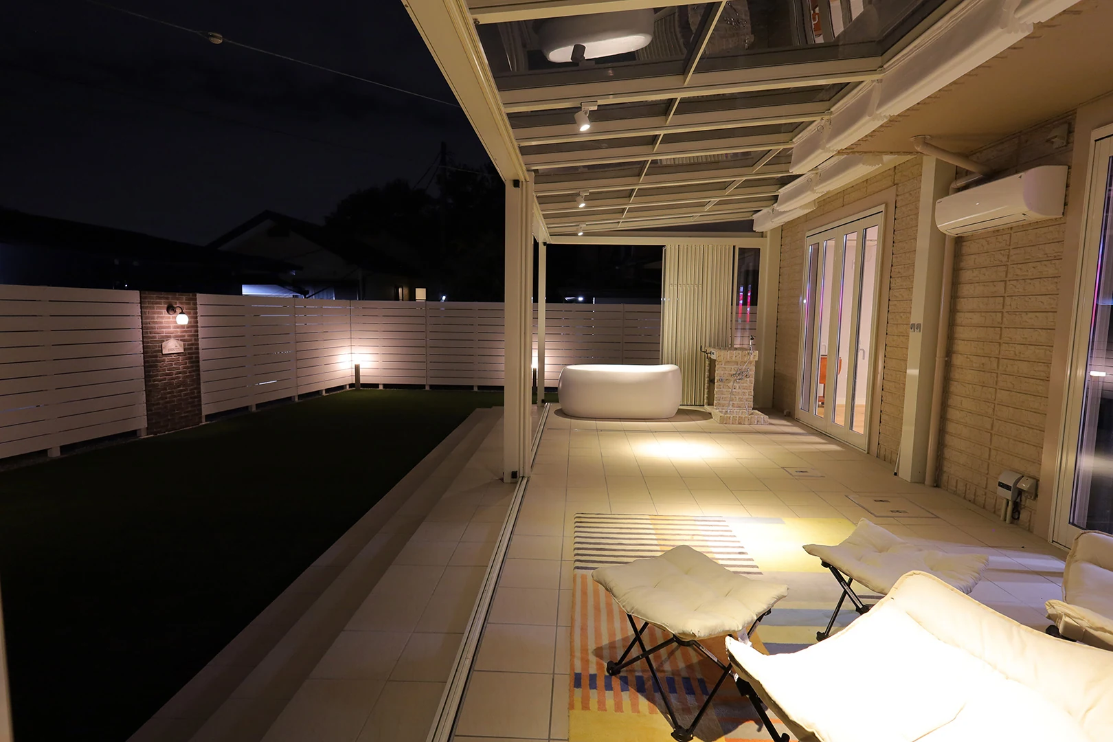 照明は、ガーデンルーム内を照らす4灯のほか、点在するライトがお庭全体をほんのりと明るく浮かびあがらせ、安心感と、広々とした心地良い空間を感じることができます。