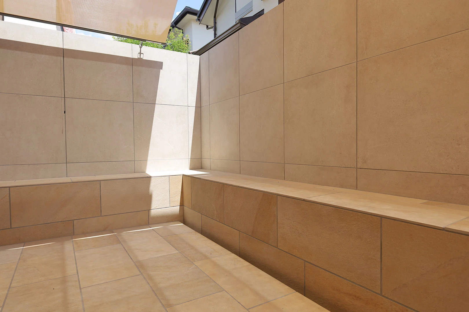 タイル: リビエラ ピュアストーン、 リビエラ バルジェ / 日よけシェード:タカショー フレームポーチ、LIXIL スタイルシェード / フェンス:F&F マイティウッド プレミアム / 人工芝: グリーンフィールド リアリーターフ