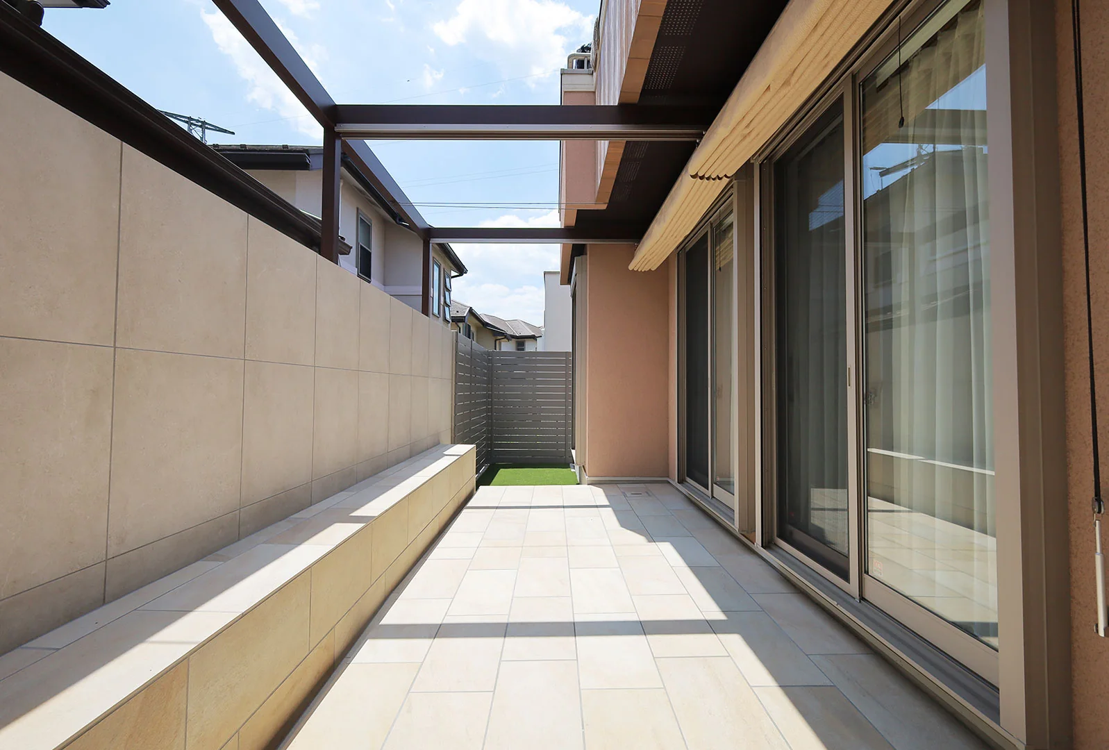 一番のポイントは、日よけシェードの柱を壁の上に設置した事です。視線が遮られることなく、広々とした空間を感じることができます。