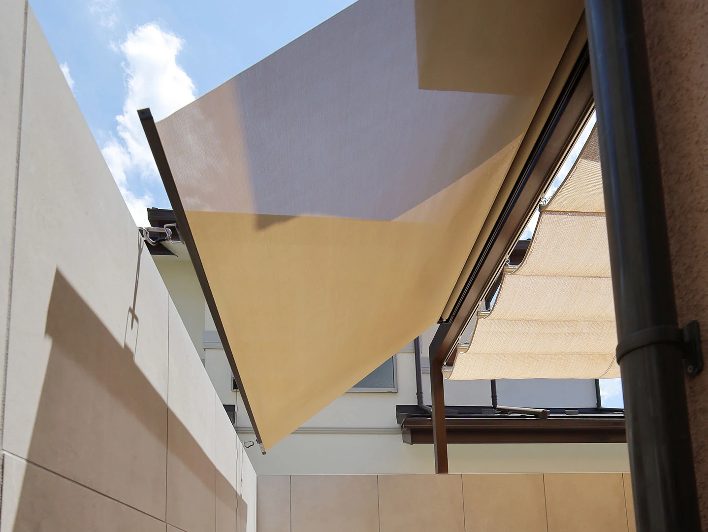 一番のポイントは、日よけシェードの柱を壁の上に設置した事です。視線が遮られることなく、広々とした空間を感じることができます。