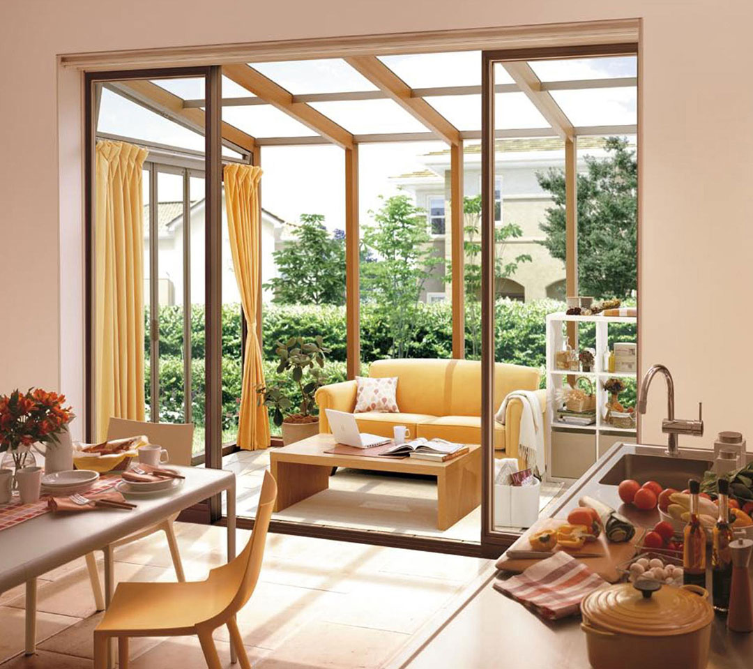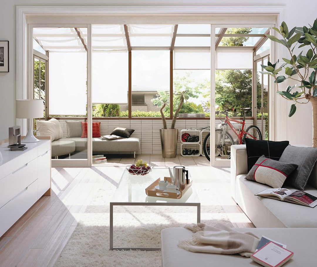屋根と壁のあるお部屋のような空間です。家族のリビングとして、朝日を浴びる朝食タイムや、夜のリラックススペースとしても。リビングとひと続きにするとお部屋が広くなったようです。