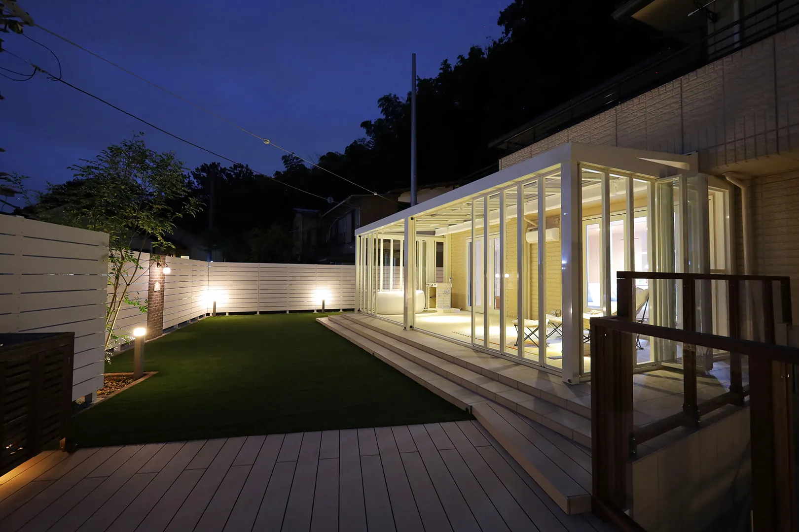 バスタブのあるガーデンリビング。夜も楽しむ照明デザイン