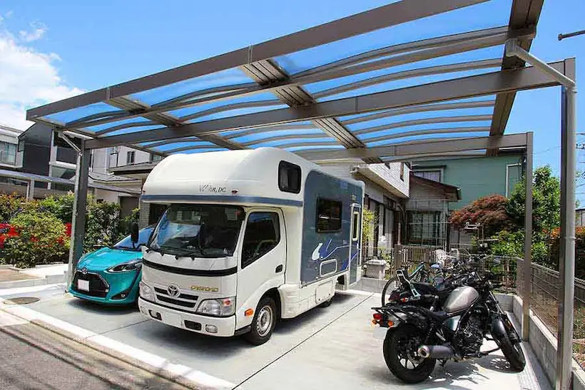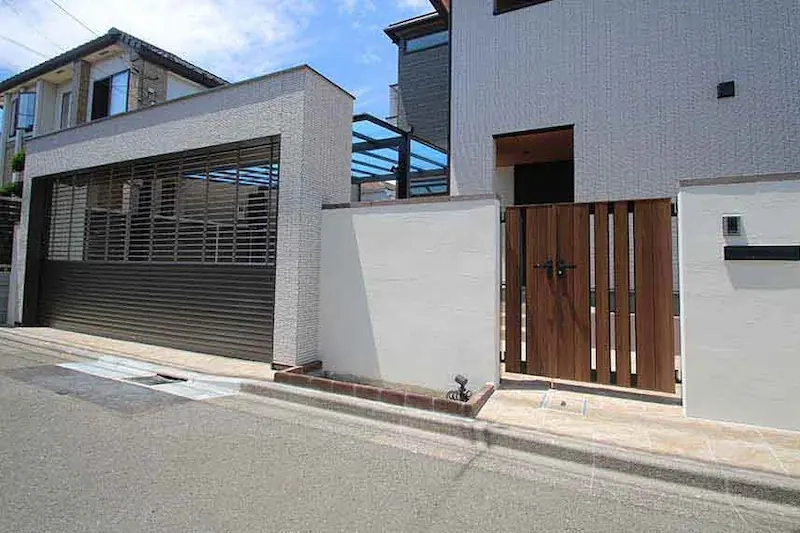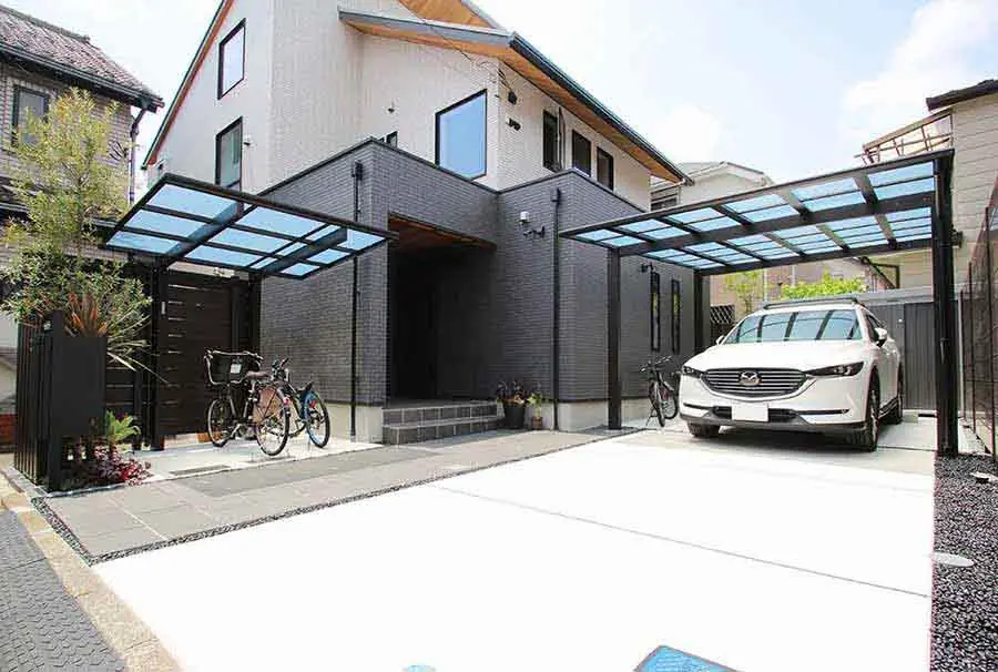 木目調の引き戸がある外構。自転車4台を停められるエントランス