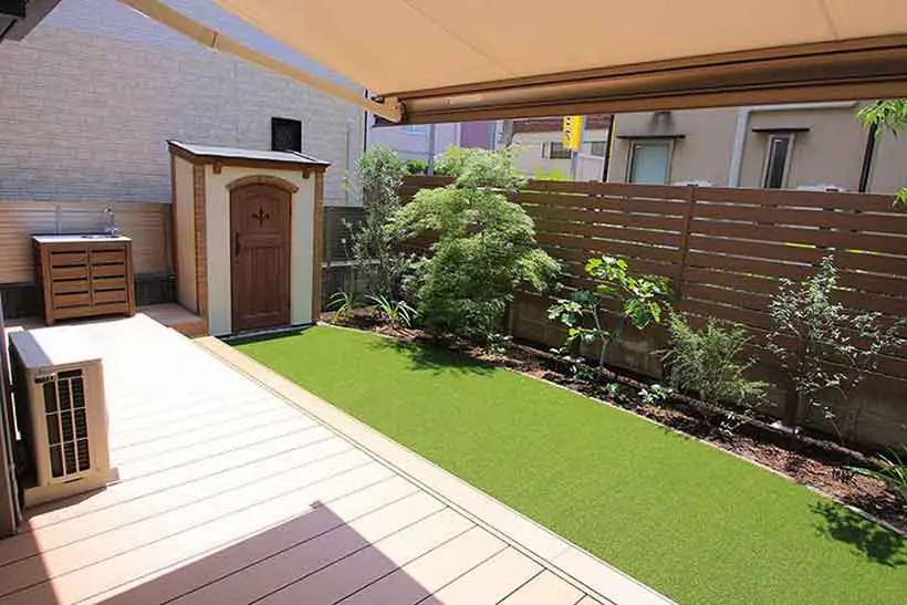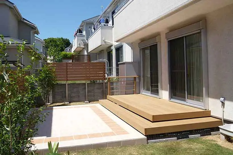 お洗濯物が干せるウッドデッキ。目隠しを工夫して安心感のあるお庭へ