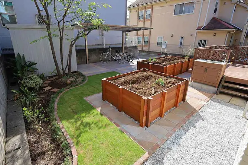 お庭を畑に! 家庭菜園を楽しめる、レイズドベットのあるお庭
