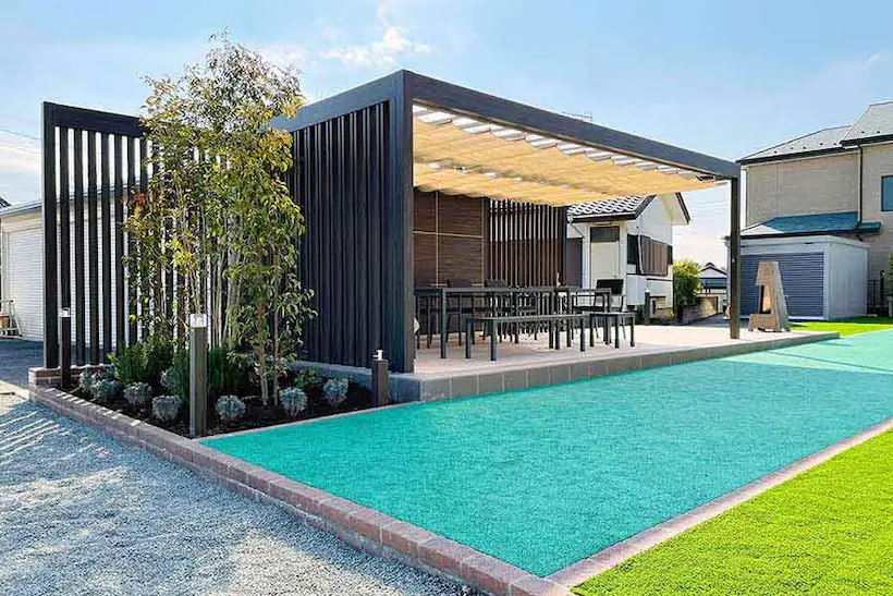 たっぷり大きな日陰が涼しい。パーゴラシェードのある優雅なテラスガーデン