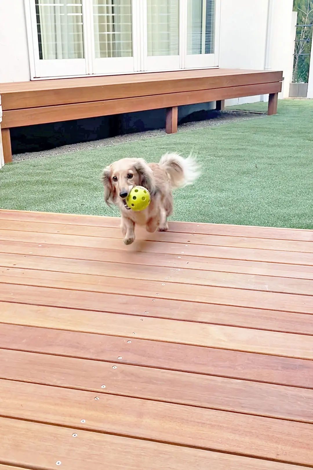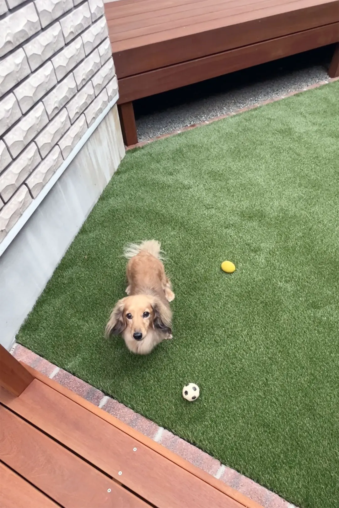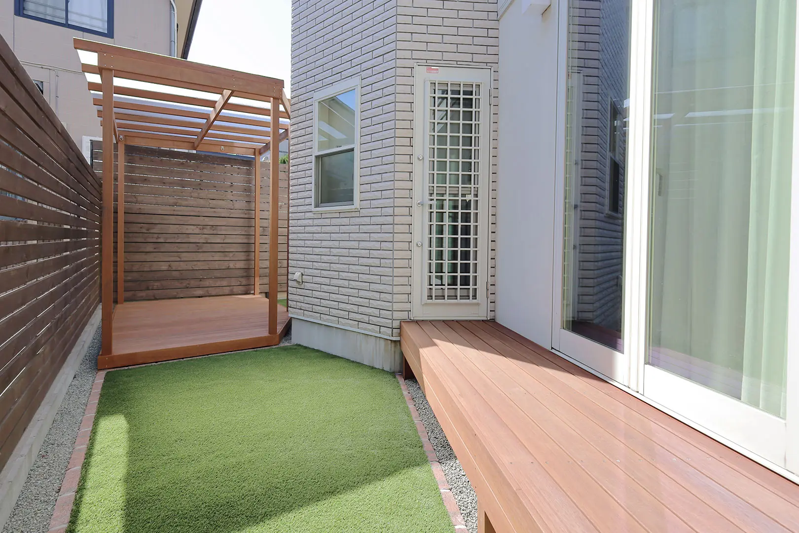 デッキ以外の場所には人工芝を敷設し、愛犬のドッグランに。ウッドデッキは段差を低くおさえたローデッキですので、小型犬のワンちゃんでも段差を気にせず走り回れます。