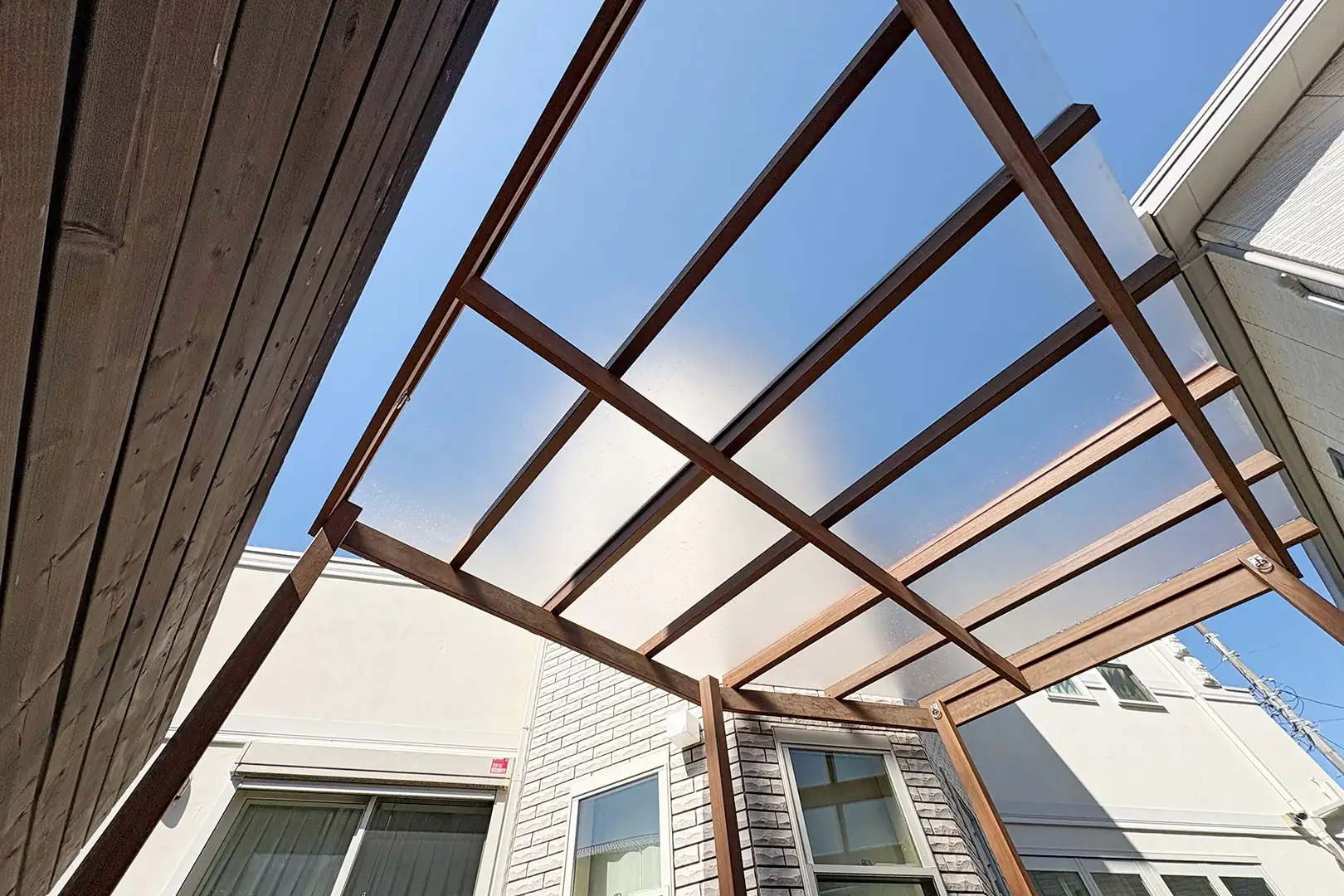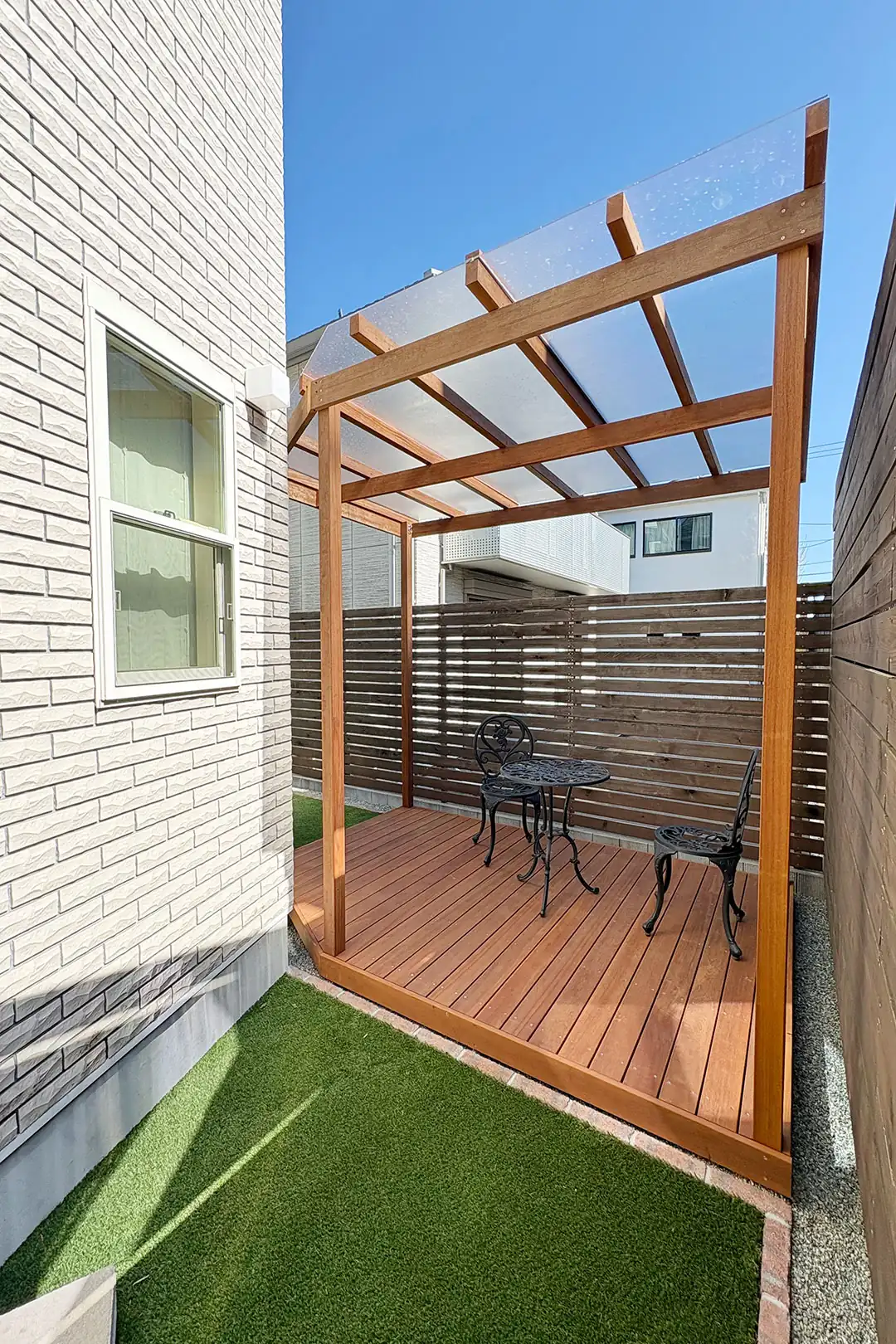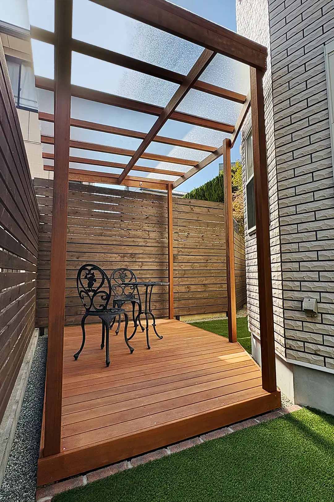 ウッドデッキは、フェンスと屋根が周囲からの目隠しになり、プライベートな空間を実現しました。パーゴラ屋根のポリカーボネート材が程よく光を通し、明るい空間になりました。