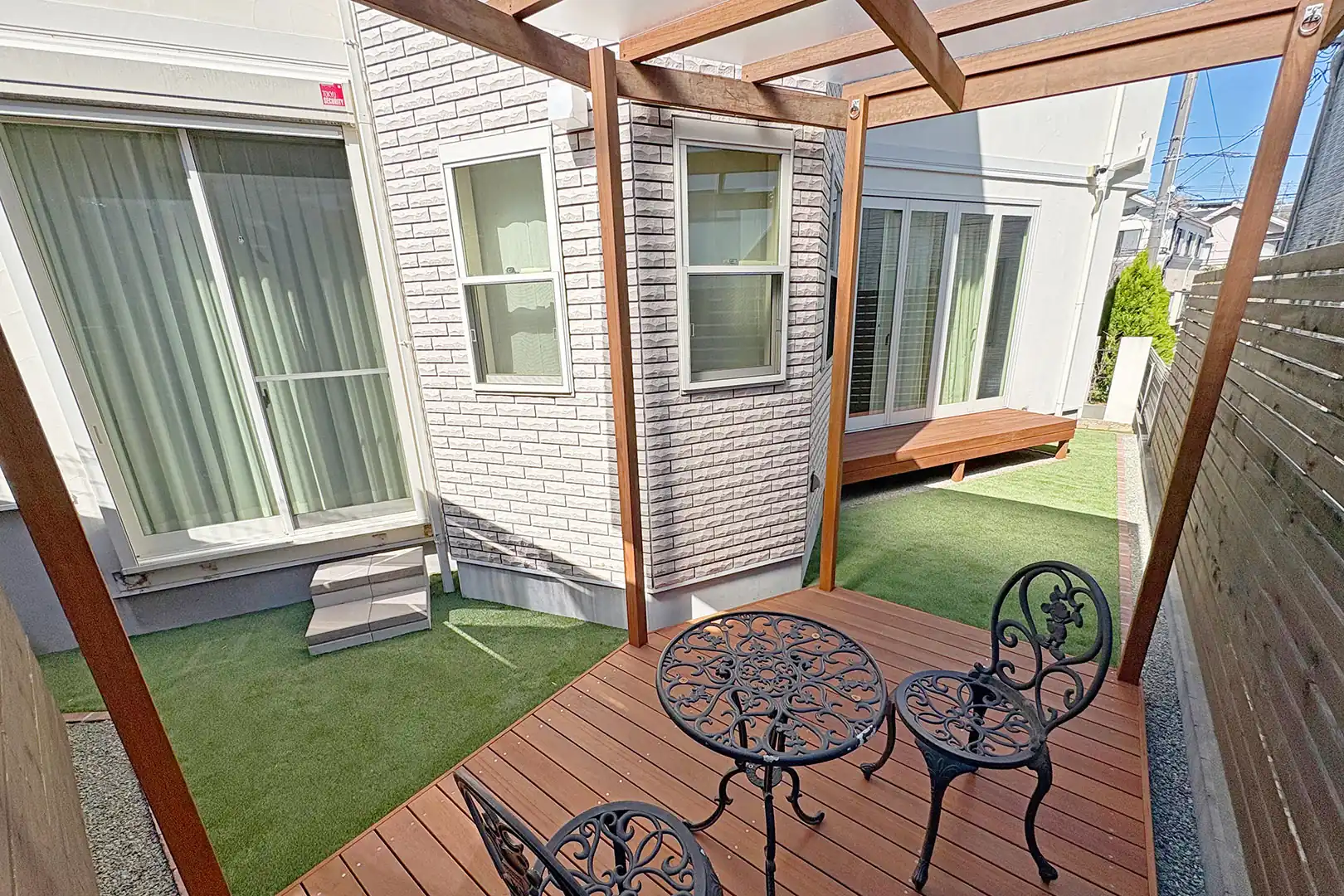 ウッドデッキ:ウリン材 / 屋根材:ポリカーボネート / 人工芝:グリーンフィールド リアリーターフ