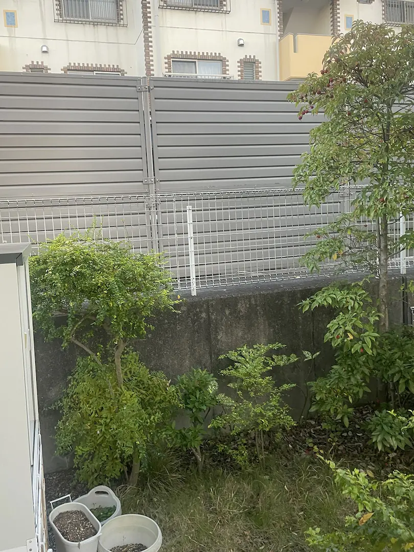 フェンスは、「目隠しをしながらも、ほどよく視線を通して防犯性も重視したい」とのご要望でしたので、フェンスの隙間を特注で広げ、丁度良い透け感を実現しました。