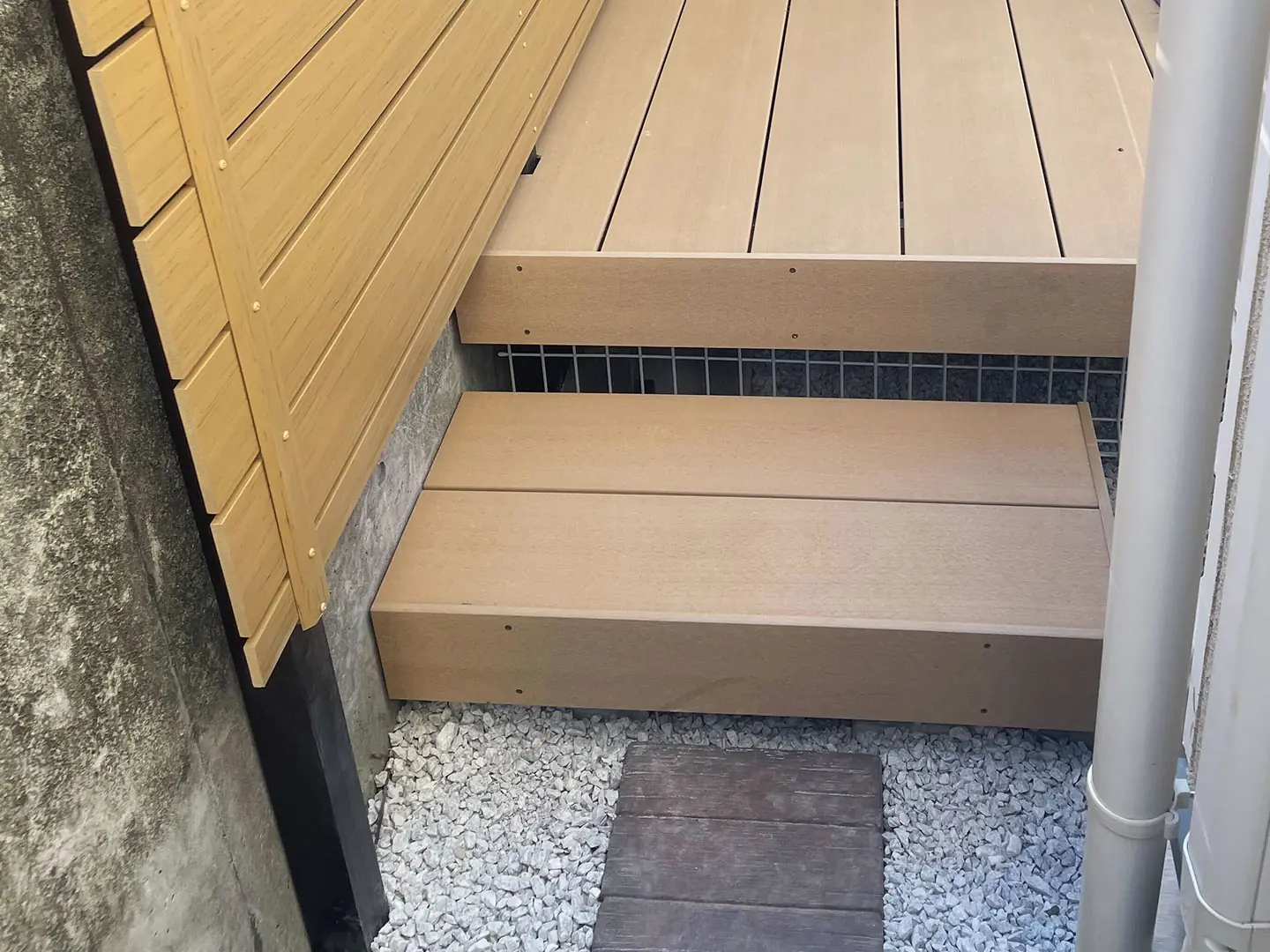 ウッドデッキ:LIXIL レストステージ/ フェンス:F&Fマイティウッド デコⅡ、ラインスタイルLタイプ