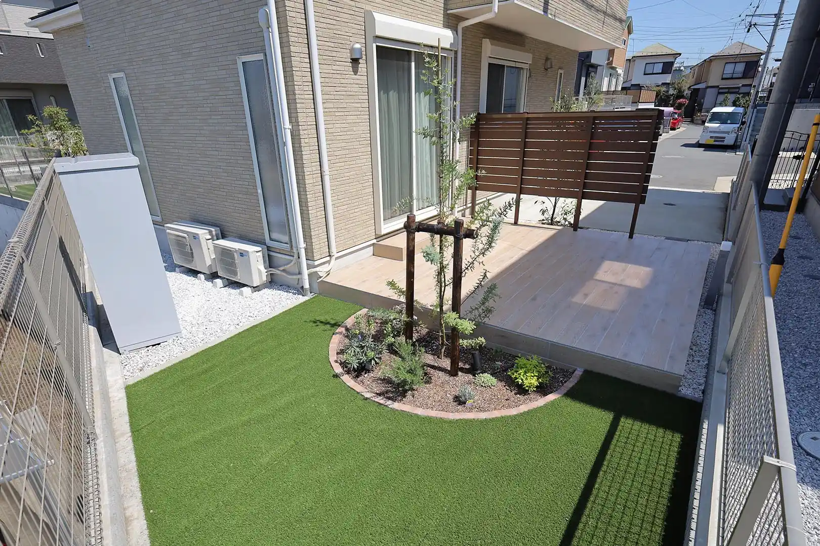 お庭は袋小路の突き当りに位置するため、人通りは多くありませんが、視線がまっすぐに入ってきます。そこで、目隠しフェンスを建て、さらに植栽を添えました。植栽に視線が集まり目隠し効果が高まります。