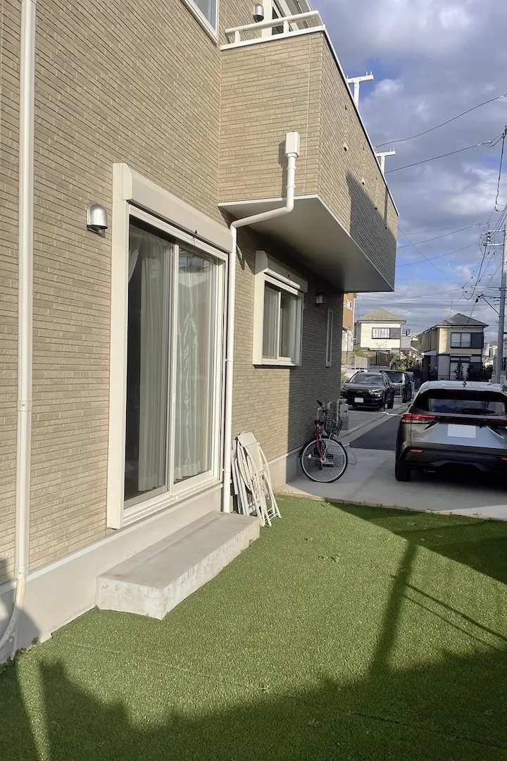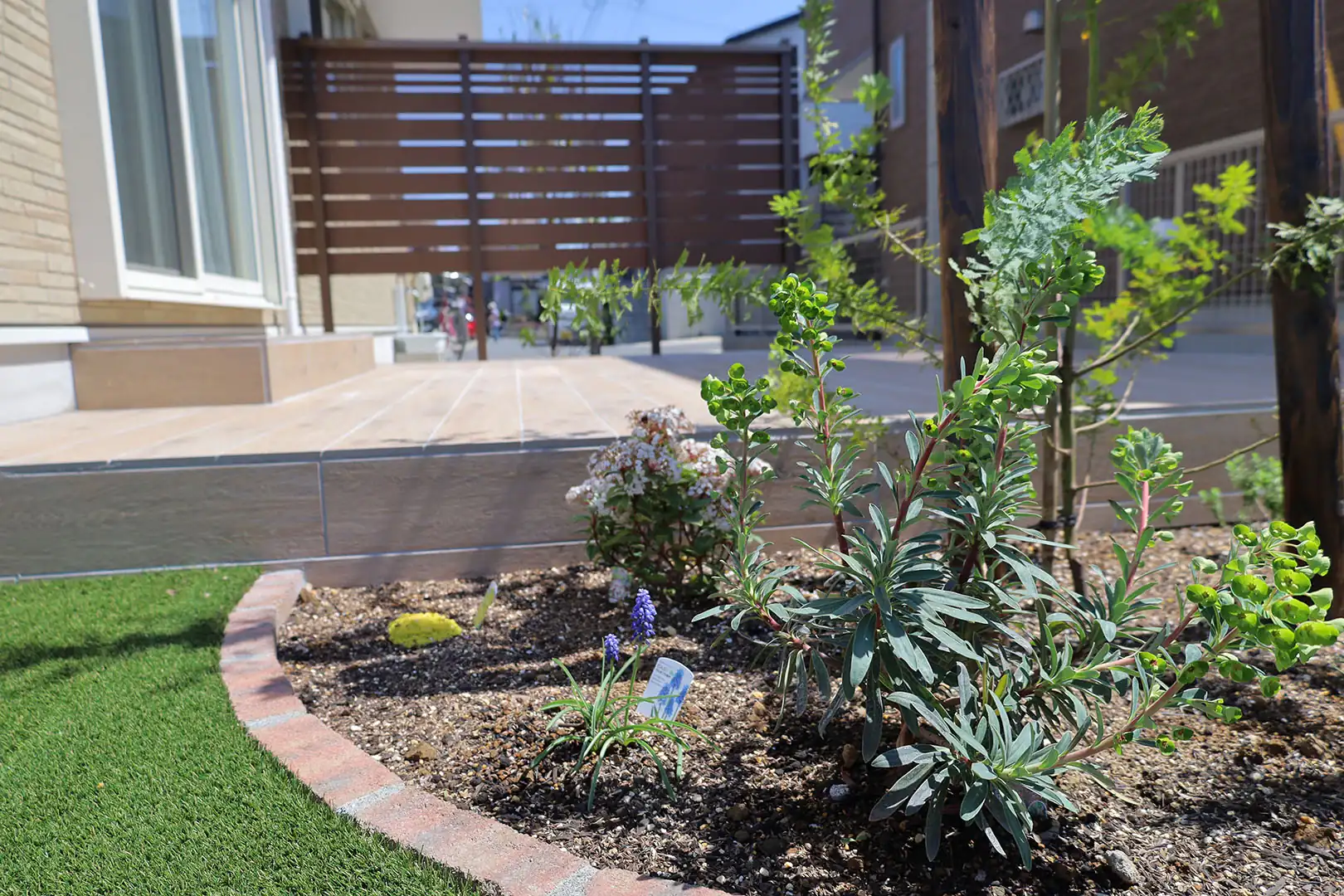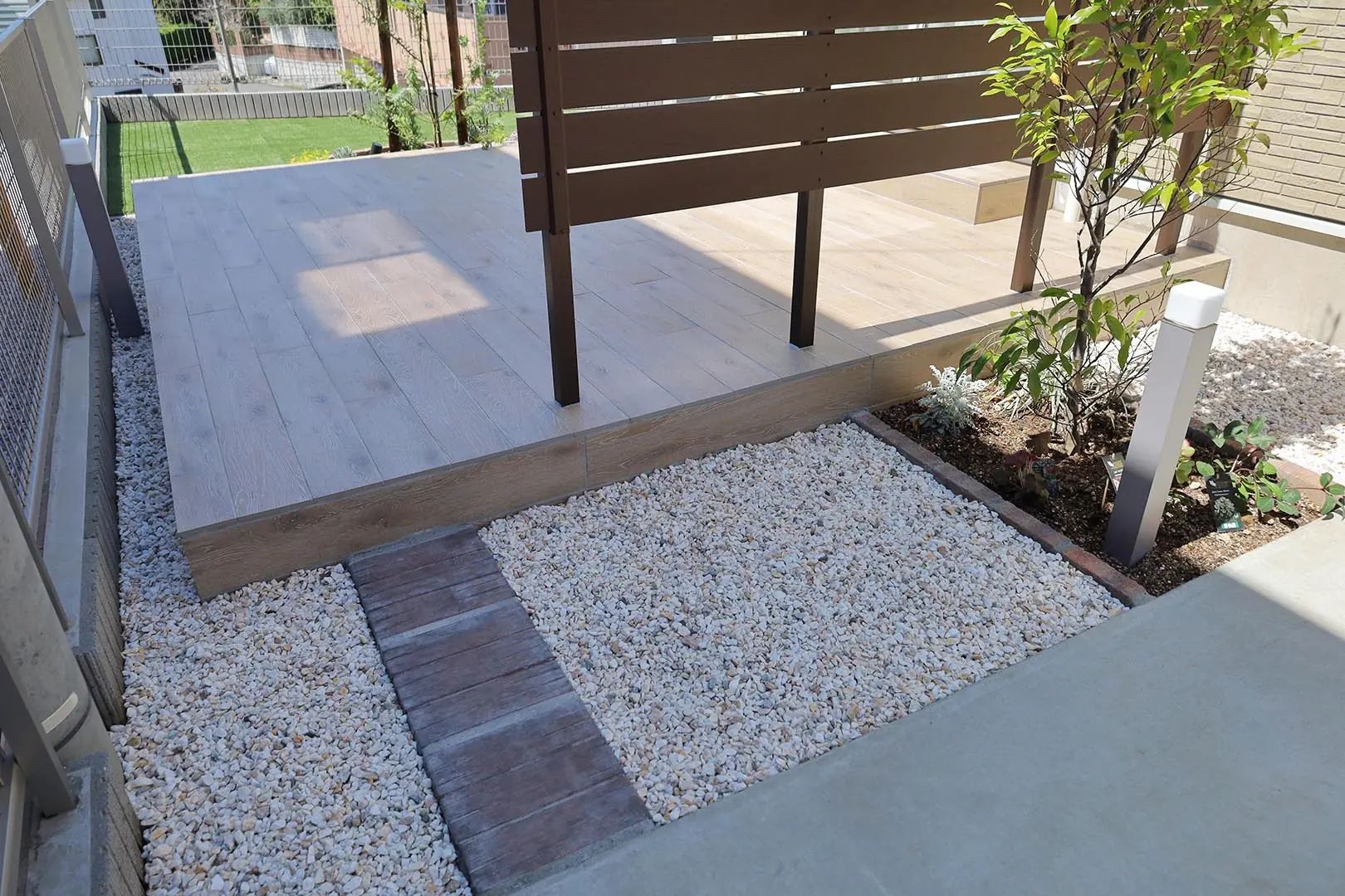 タイルテラスは、室内からテラス、テラスから人工芝や駐車場へ、段階的に上り下りできる設計です。それぞれの段差が小さいので上り下りにストレスがなく、お庭全体を歩きまわることができ、視覚的にも広々と感じられるメリットがあります。木調のタイルが、植栽やボーダーフェンスと調和するナチュラルテイストのお庭になりました。