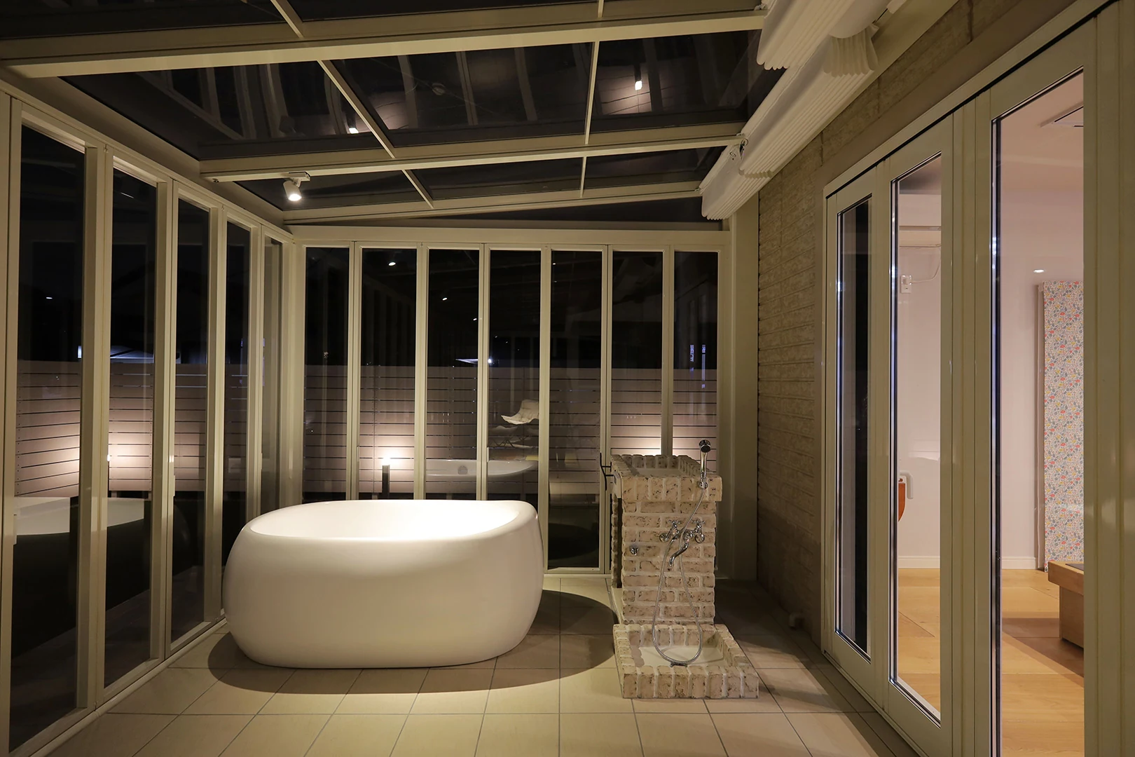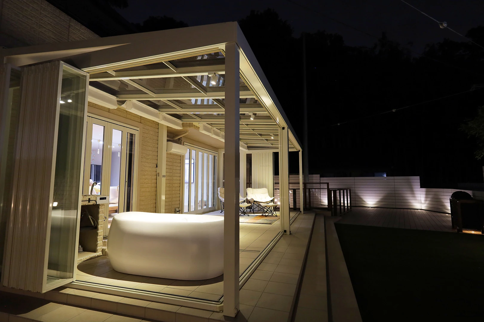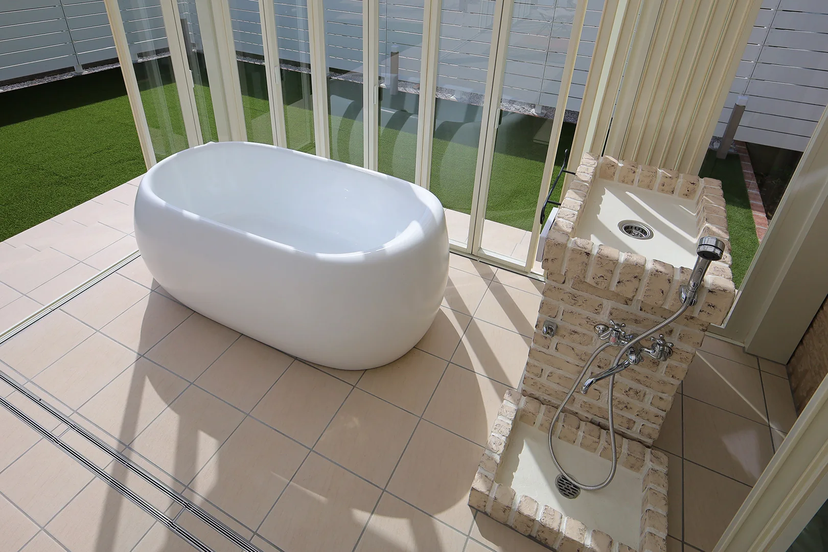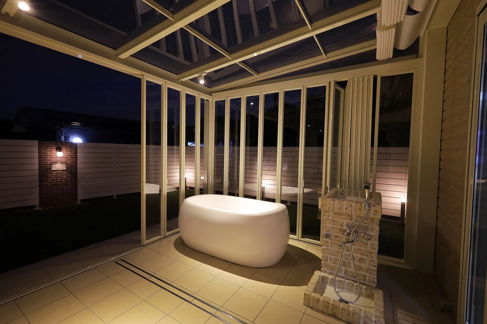 ガーデンルーム:LIXIL エクシオールジーマ、ダウンスポットライト / タイルテラス LIXIL コンテⅡ / バスタブ:ミラタップ オフリーピロー / シャワー付きシンク:ニッコー ショートタイプ レトロブリック / 人工芝 グリーンフィールド リアリーターフ ミドル+ / 目隠しフェンス:エコモックフェンス、ディーズガーデンアルファウォール ブリックパネル / 舗装: SBICロシェ・ナチュラル / フェンス照明: ディーズガーデン ディーズライト グラスランプ / ガーデンライト:タカショー エバーアートポールライト / 引き戸:LIXIL アウタースライドA 型 / 手すり:LIXIL グリップライン
