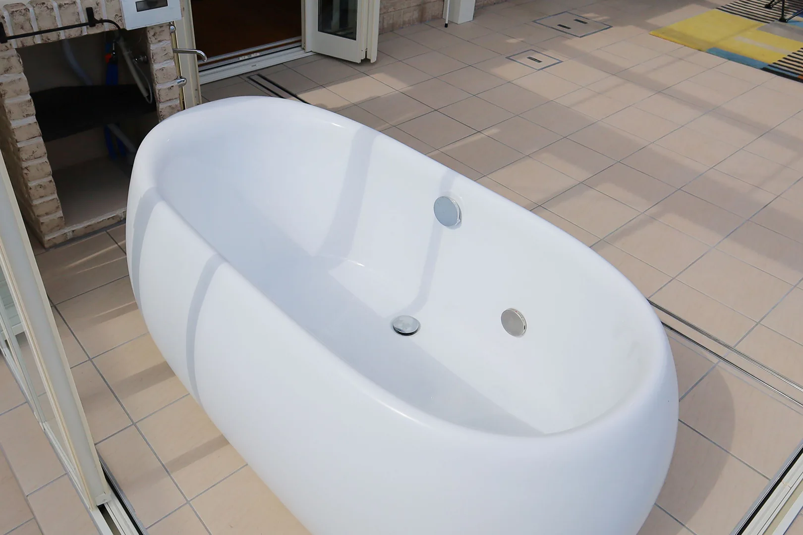 バスタブは、ご主人様たってのご希望を実現したもの。給湯器を備え、シャワーはもちろん追い炊きも可能で、通常の浴室と変わらない使いやすさを実現しました。手の届く場所にタオルかけをつけるなど、動線をお客様と相談しながら丁寧に設計しました。じっくりとお湯につかってリラックスしながら広い空をあおぐ、そんな特別な解放感を楽しめます。