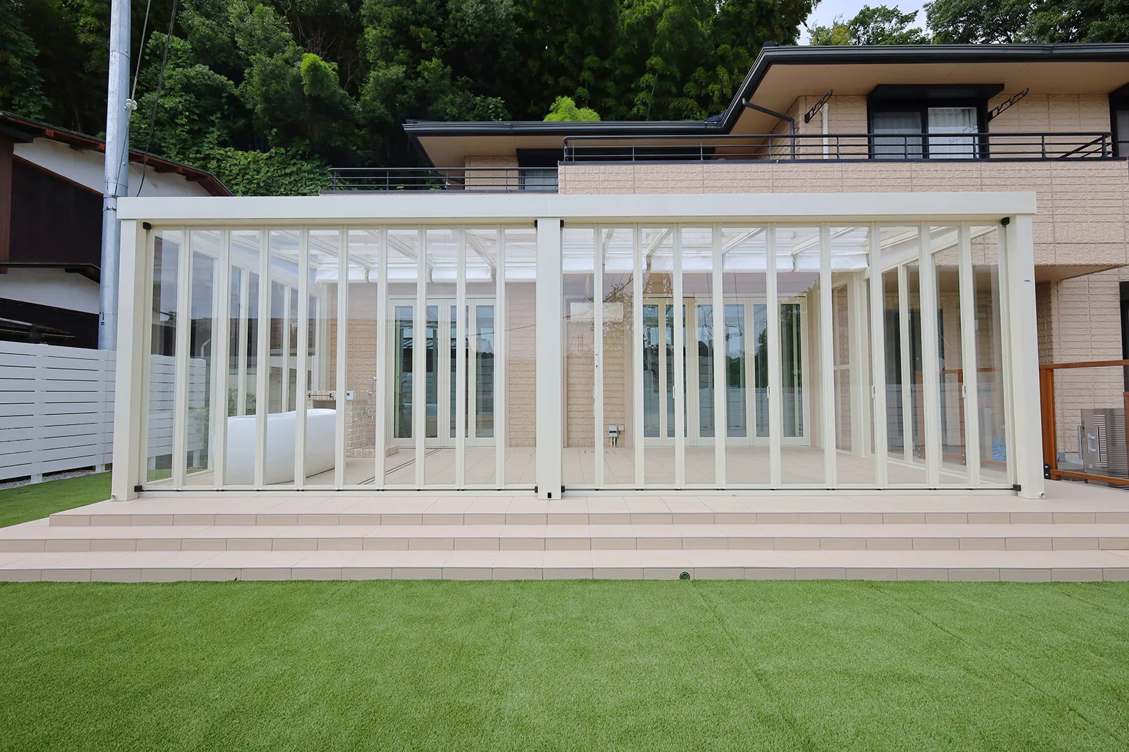 特にご希望を頂いたのが、ガラス張りのガーデンルームです。扉を閉めてお部屋のような感覚で使うほか、季節によっては扉を全開して、オープンテラスとしても使うこともできます。