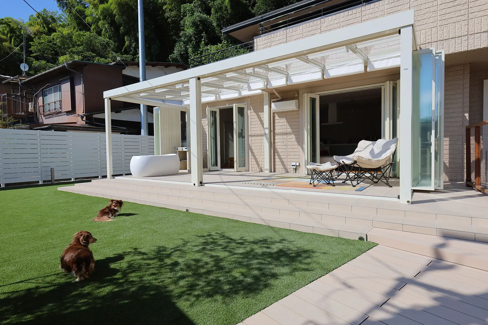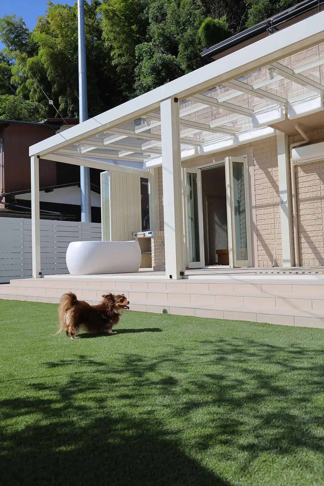 お庭は人工芝を敷設し、愛犬のドッグランとしても楽しめます。テラスの段差を低くして、小型犬のワンちゃんが自分たちでお部屋とお庭を自由に出入りができるように配慮しました。