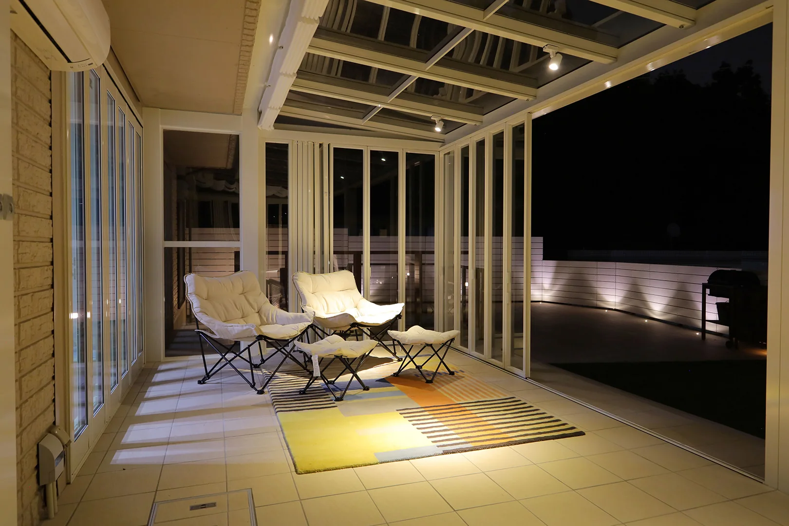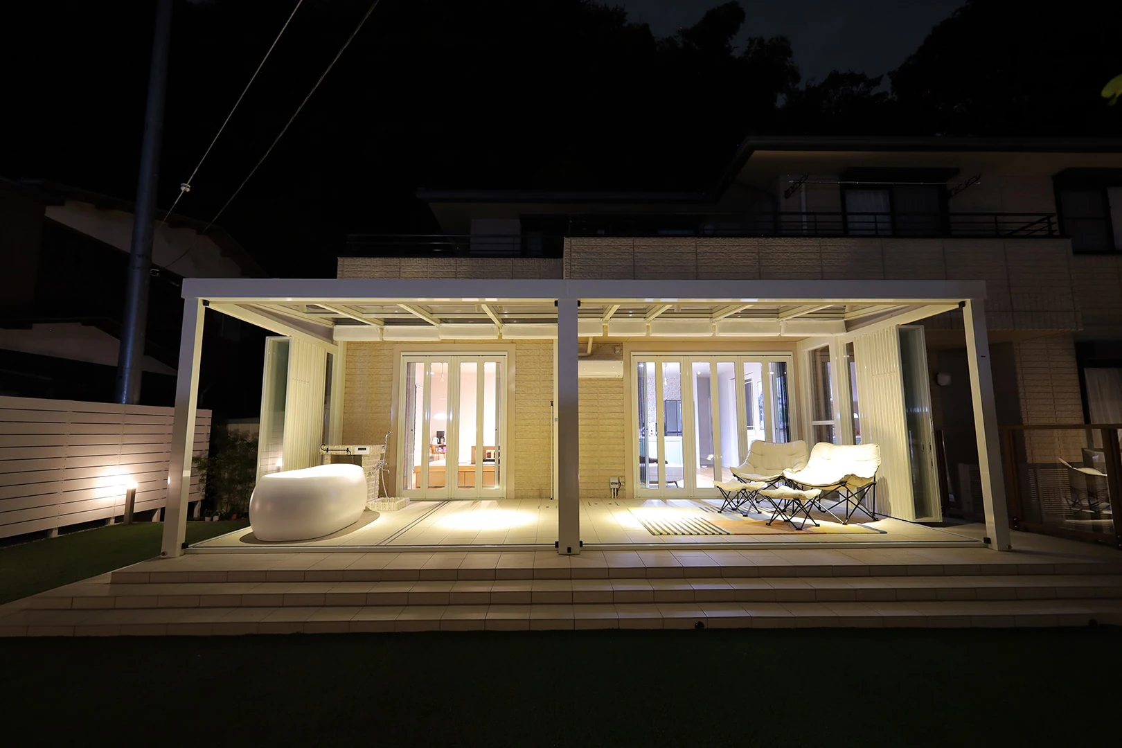 照明は、ガーデンルーム内を照らす4灯のほか、点在するライトがお庭全体をほんのりと明るく浮かびあがらせ、安心感と、広々とした心地良い空間を感じることができます。
