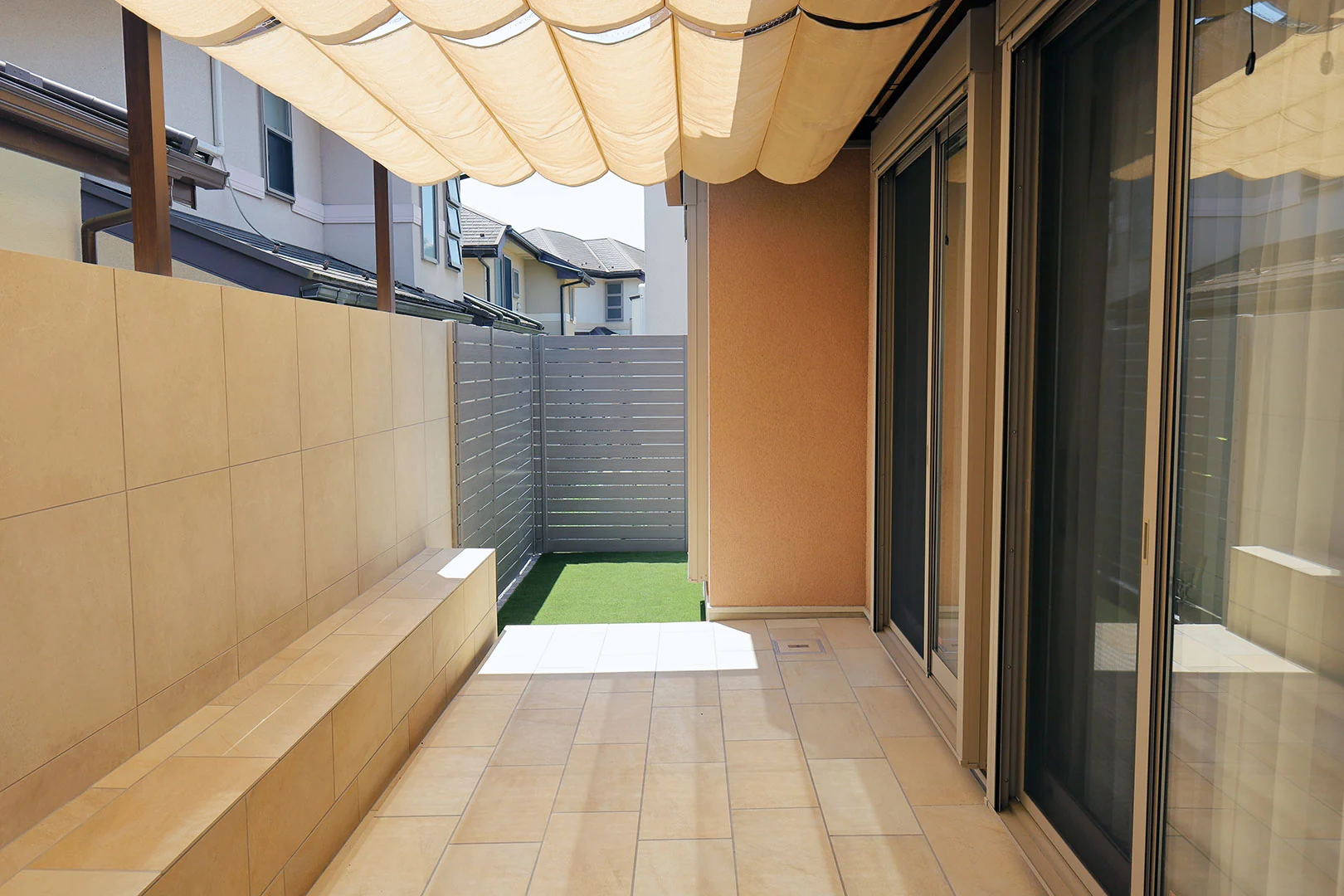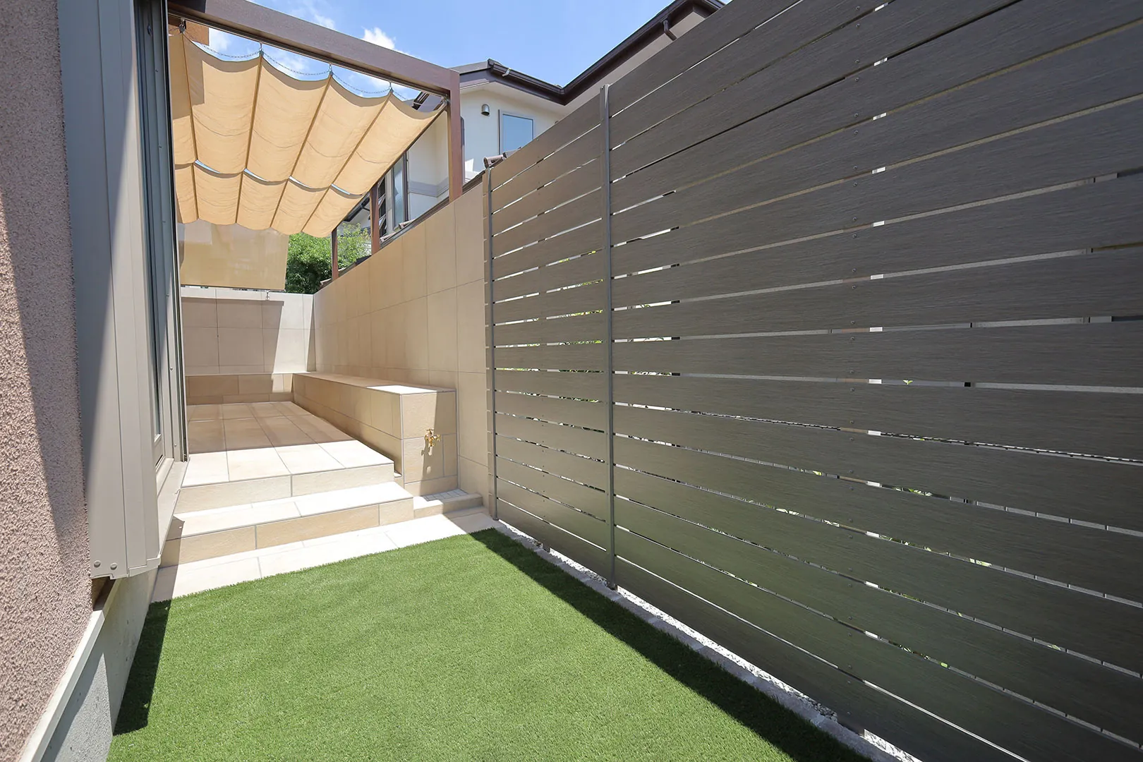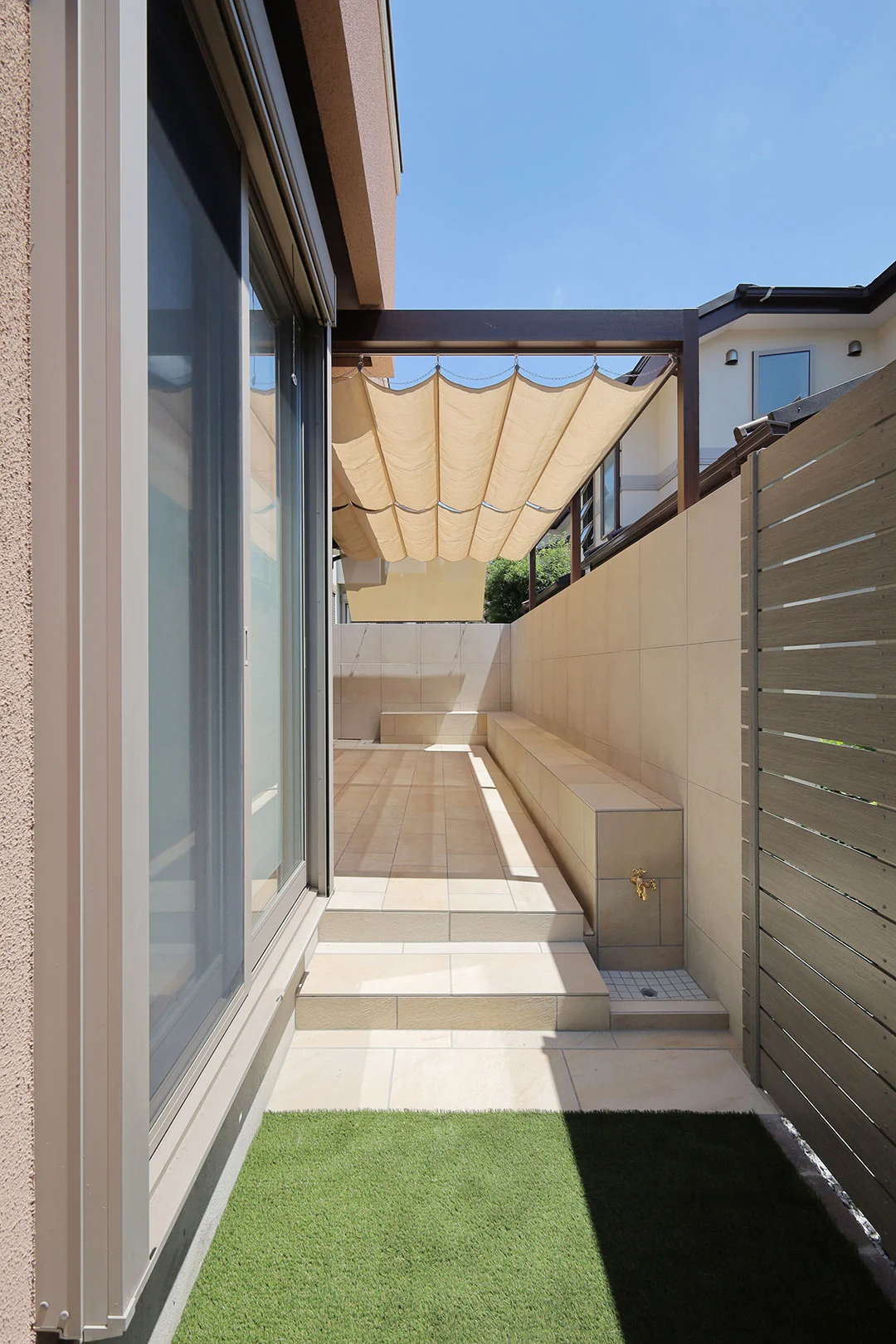 タイル: リビエラ ピュアストーン、 リビエラ バルジェ / 日よけシェード:タカショー フレームポーチ、LIXIL スタイルシェード / フェンス:F&F マイティウッド プレミアム / 人工芝: グリーンフィールド リアリーターフ