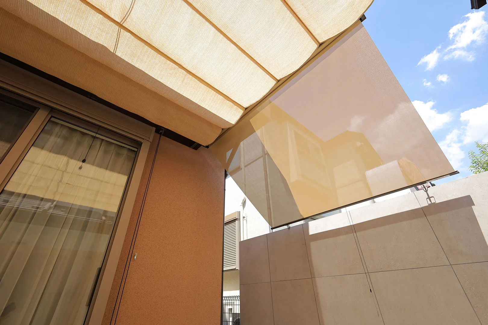 一番のポイントは、日よけシェードの柱を壁の上に設置した事です。視線が遮られることなく、広々とした空間を感じることができます。