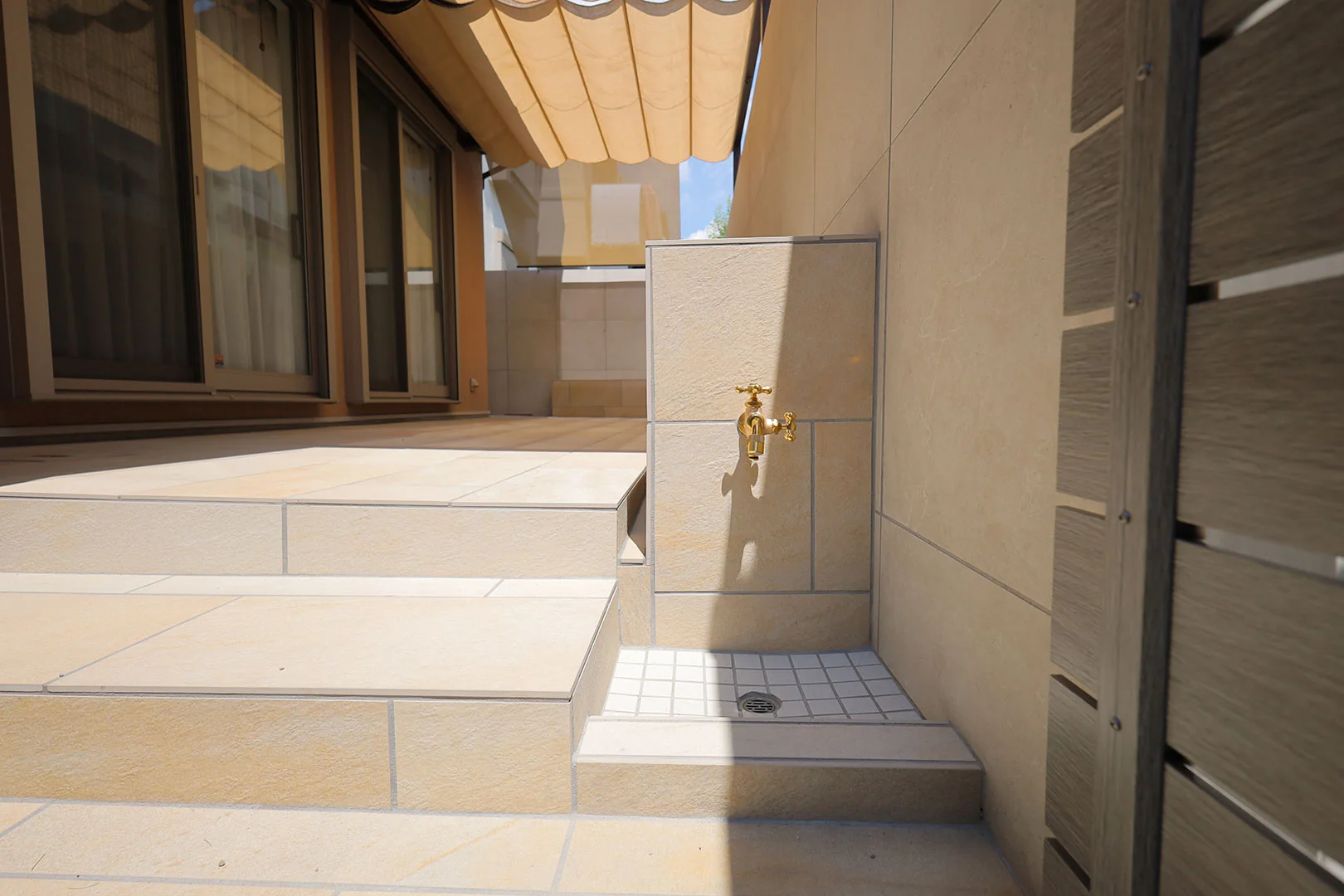 愛犬の足洗いにも便利な水栓。蛇口横の小さな溝がテラスの雨水を集める構造